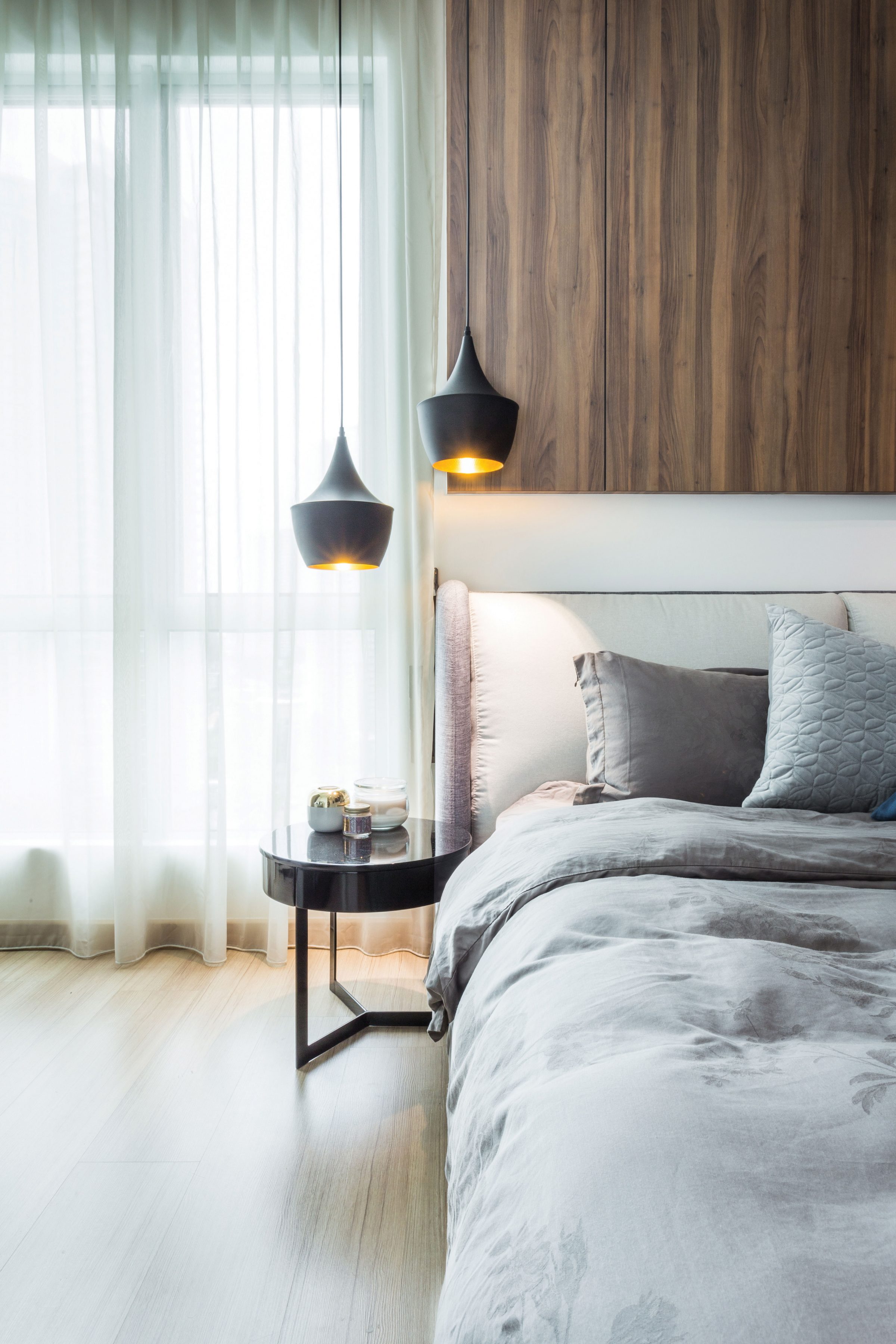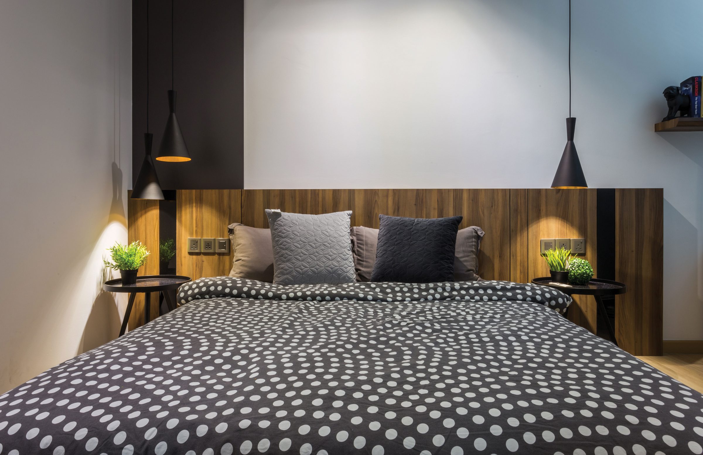 Bedside Symmetry: A continuous stretch of wood serves as a headboard, and as the background for a pair of circular Scandinavian end tables – apparently three-legged variations of the Marcella paint dipped spindle and tray end tables, appointing both sides of the bedstead.