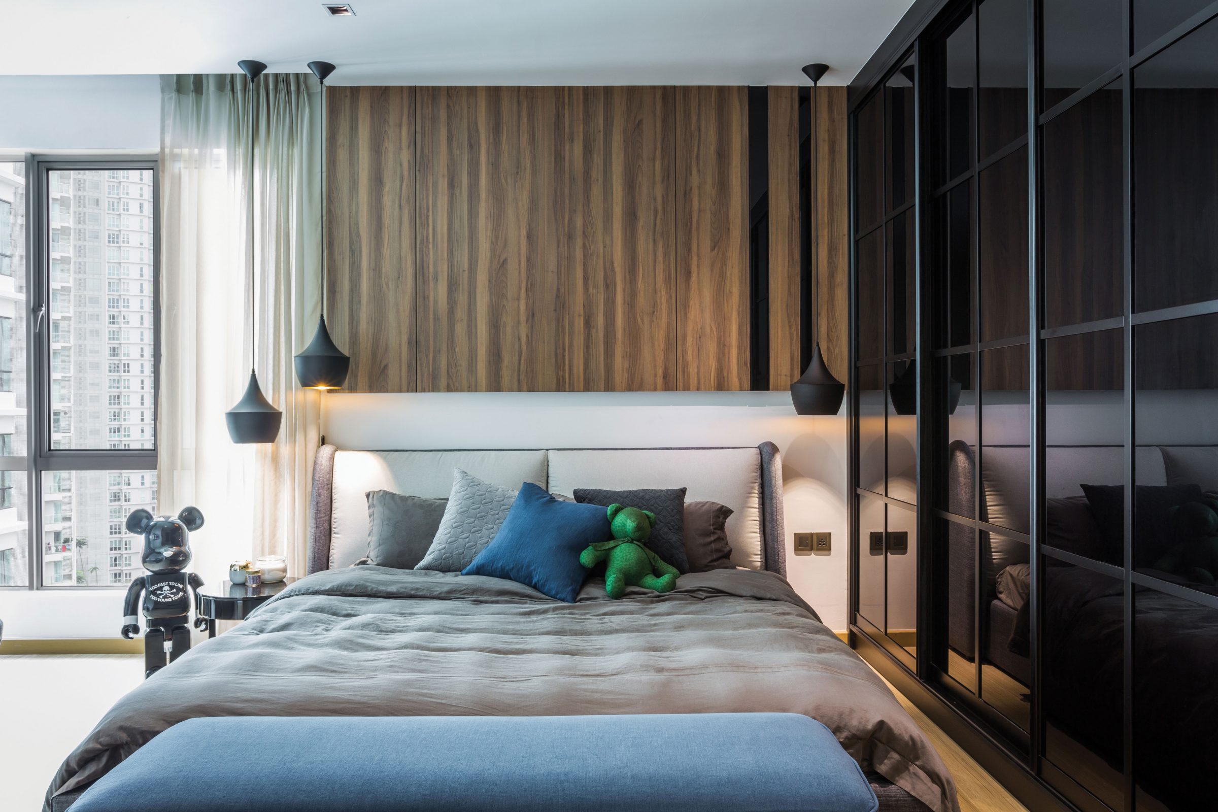 Pendulant Illumination: Modern pendant lights of ubiquitous designs punctuate the narrow confines of the kitchen corridor, while the wide profiles of Tom Dixon’s patinated brass Beat lamps adorn a robust bedstead.