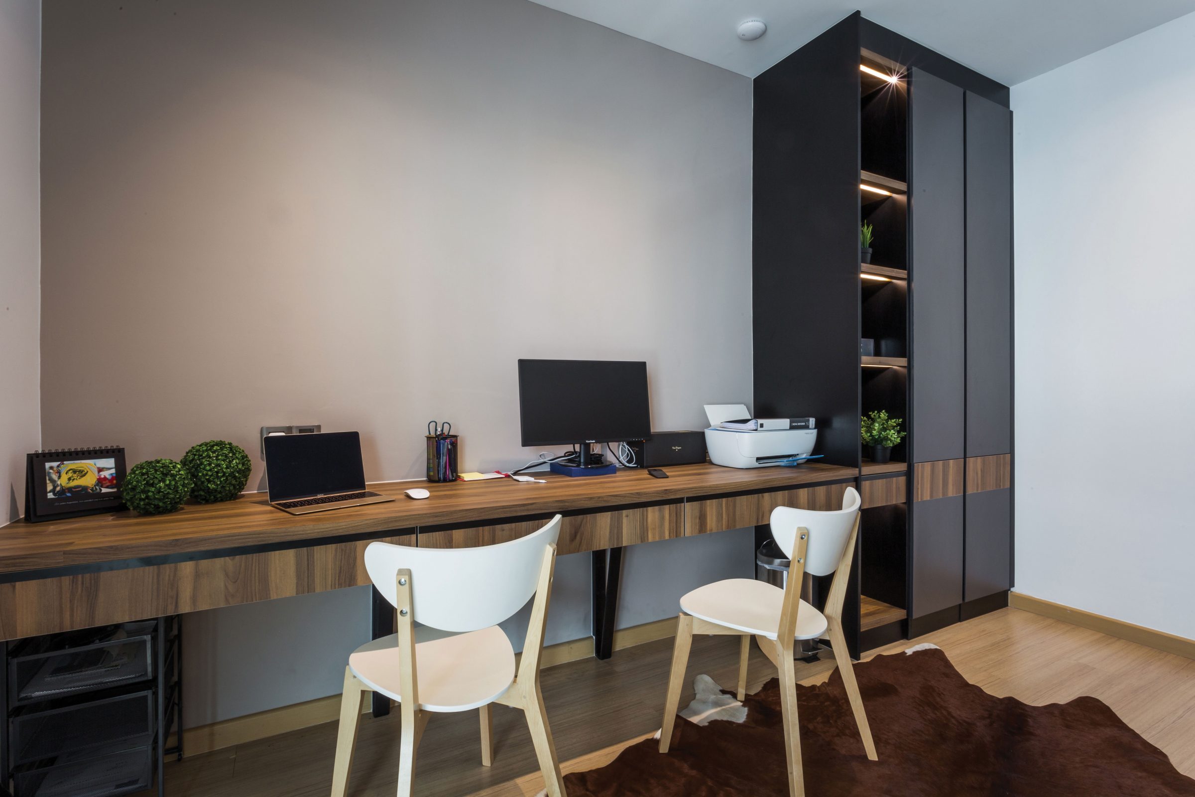 Beyond the entryway, the grey walls transition to host an array of lit shelving grids of pale wood streaking across a white background to reflect the brightness of the home.