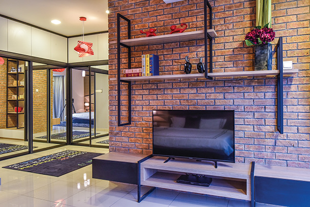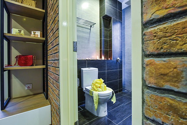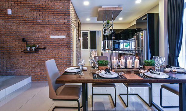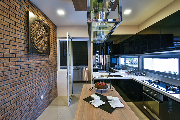 The dainty metal clock that hangs on the brick wall contrasts with the elegant and chic ambiences that flow throughout the living spaces.