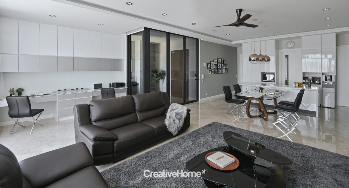 Carrara marble is seen once again in the adjacent kitchen countertop, complemented by pristine white cabinet surfaces to keep the kitchen theme consistent. Right next to it, a dining set with black chairs and a glass-topped table blend effortlessly with the all-white kitchen. The white cabinetry continues all the way to wet kitchen which is done up in a galley-style layout to maximise the narrow space.