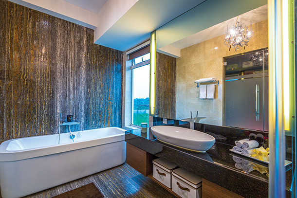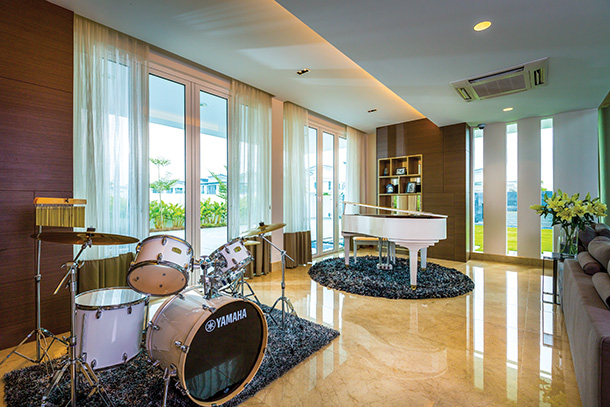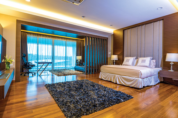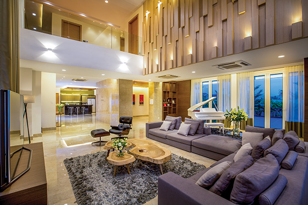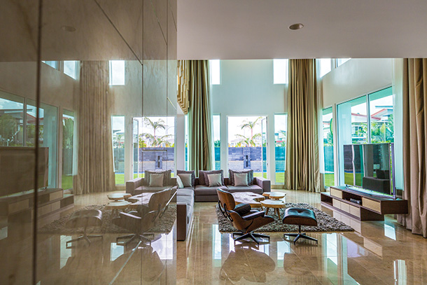 The double height ceiling in the lounge amplifies the grandeur in this sleek space. Based around a brown colour scheme, shades of dark oak brown, mocha, to golden caramel creates a stylish and warm setting for this area. Furniture is simple, complementing the contemporary and elegant space, such as the roomy sofa, the leather chair set and the wood coffee table. Décor adds dainty character to the large lounge, whilst beautifying the ambience. Lush caramel curtains that hang around the windows complement the style of the lounge as well as the golden hue of lights that glow from the wood feature wall.