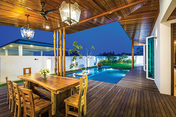 Wonderful in Timber. The outdoor dining set is made from timber, enhancing the rustic charm and character of the home.