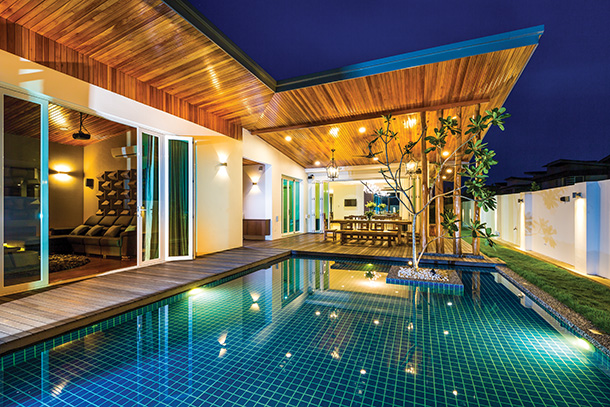 The dining room is minimal but stunning. A large glass circular dining table stands in the centre of the space, surrounded by slender timber dining chairs. Adding volume and airiness to the dining area, sliding doors open out to the patio area, which leads out to the outdoor dining area and a swimming pool. Prettily decked out in timber, the outdoor area has a very natural and beach-hut feel to it. The outdoor dining set is made from timber, enhancing the rustic charm and character of the home.