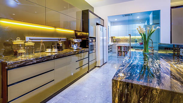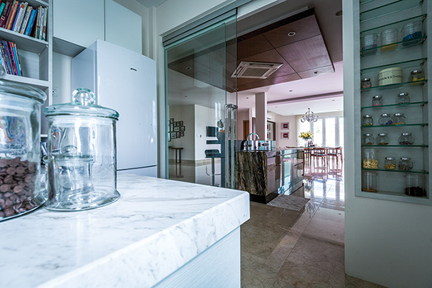 Two kitchen spaces complete the ground floor in this home, where each are lavished with rich textures. In the dry kitchen, darker tones are used accentuating a more demure and modern style. In the wet kitchen, found at the back of the home, a more classic style is adopted designed around a white palette, where the stunning white marble surface boosts the beauty of this space.