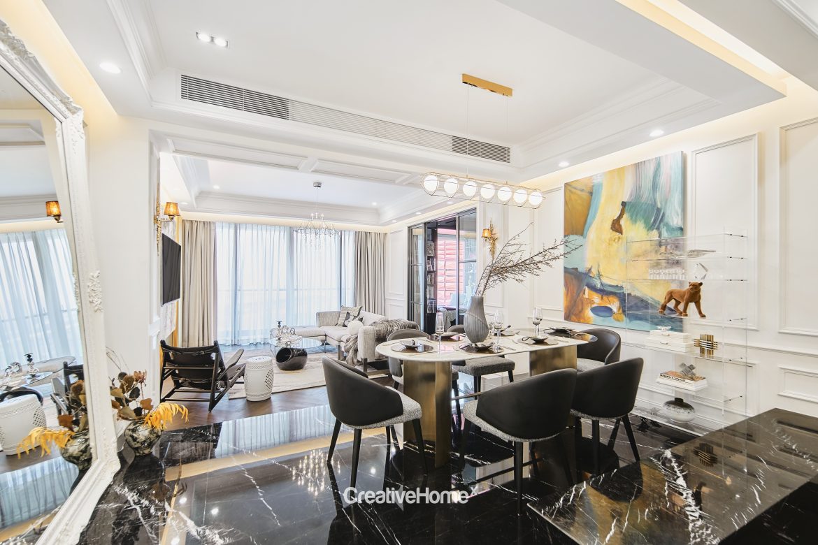 Upon entering, the foyer area welcomes you with pure white paneling, artistic paintings, and a black side table, setting the stage for the classical theme. The marble flooring, intricately arranged in a captivating pattern, creates a focal point in the entrance, establishing the elegant and classical French ambiance. Throughout the entire residence, a monochromatic palette of black and white serves as the foundational color scheme, with curved arc lines at transition points.