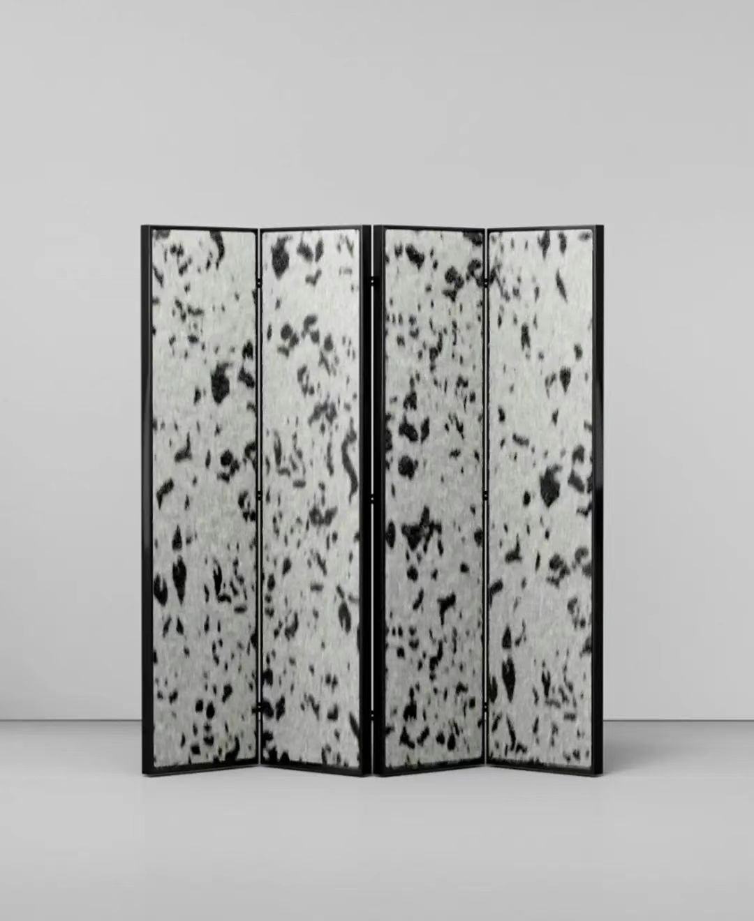 An eco-fur and lacquered wood frame screen that juxtaposes warmth and precision, embodying the subtle cultural dialogues shaping contemporary interiors.