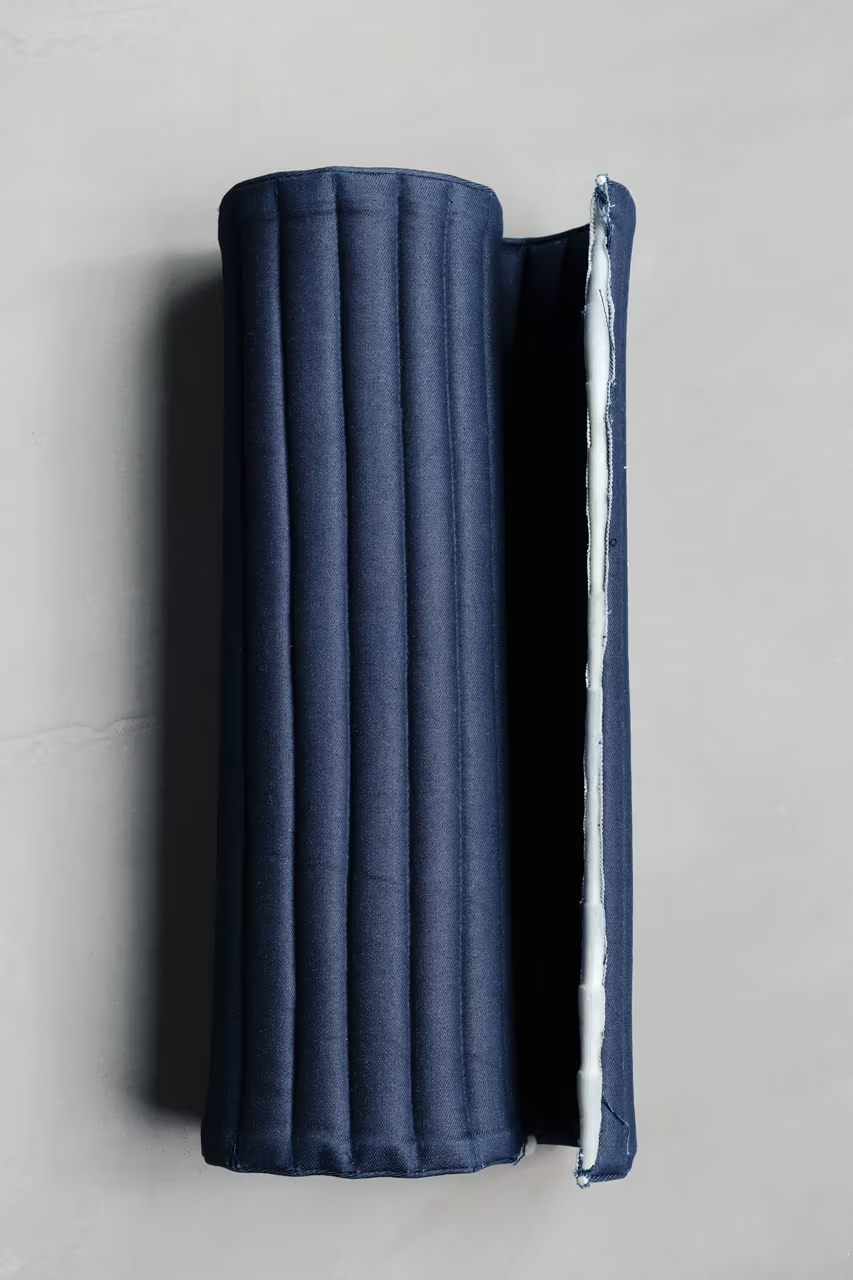 Chao’s architectural background informs the project’s focus on human–object interaction. Drawing inspiration from camping gear and military equipment, the Roll-Up Chair treats furniture as something adaptable and mobile. Over time, the denim surface is designed to age visibly, accumulating wear and patina much like a well-loved pair of jeans, turning use into a form of personal expression.