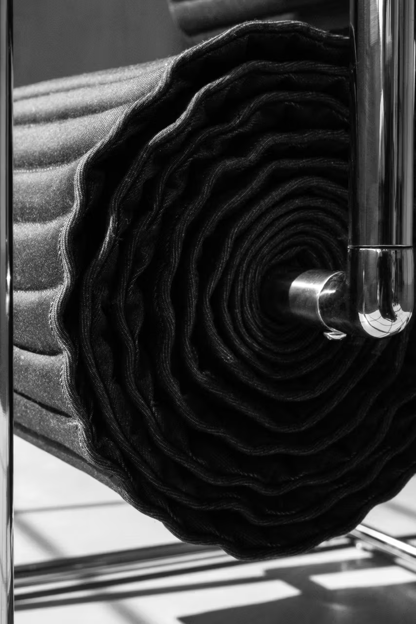 Constructed from unsold G-Star denim, steel railing components, architectural fasteners and vintage snap buttons, the chair directly references the brand’s denim heritage while embracing a raw, utilitarian aesthetic. Its most radical feature lies in its flexibility: the chair can be fully dismantled, rolled up, and even hung on a wall like a garment when not in use, challenging the conventional lifecycle and spatial demands of furniture.