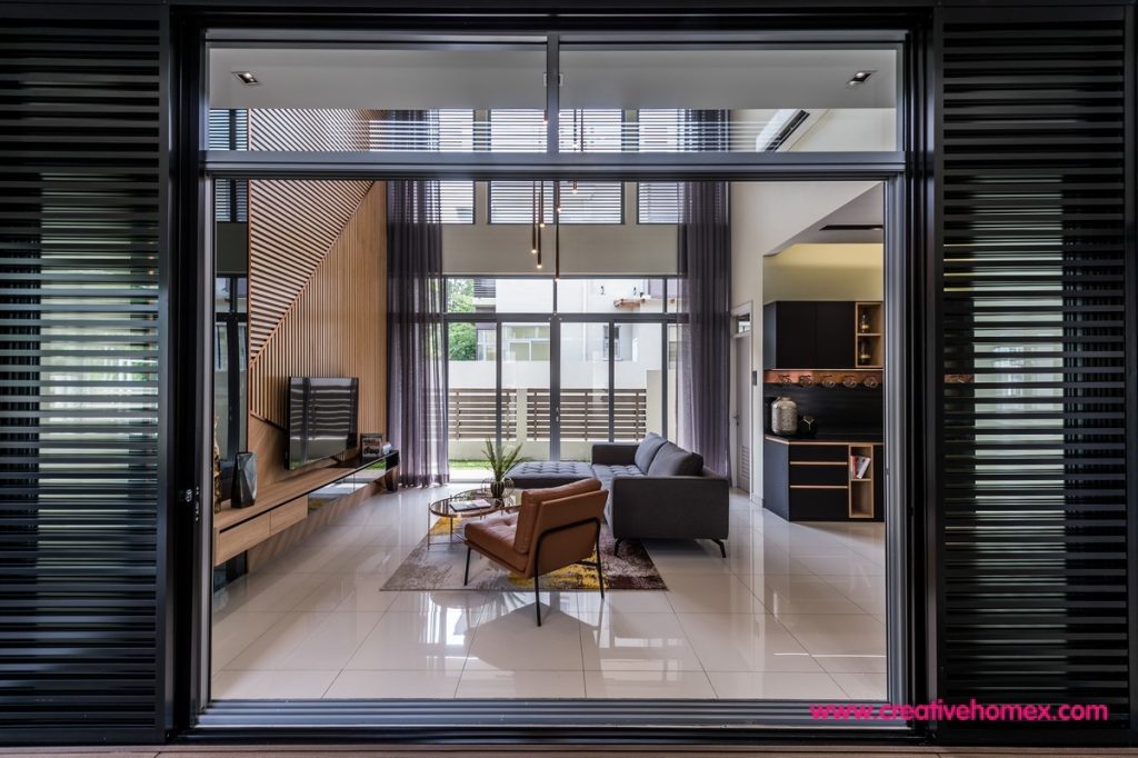 Bold lines and dramatic treatments may put this home in the spotlight, but it’s the quality materials and excellent spatial configuration that make everything work immaculately. Upon stepping foot into the living room, the edgy TV wall that ascends all the way up in the double-height space stands out immediately with its crisp sharp lines placed around sharp angles.