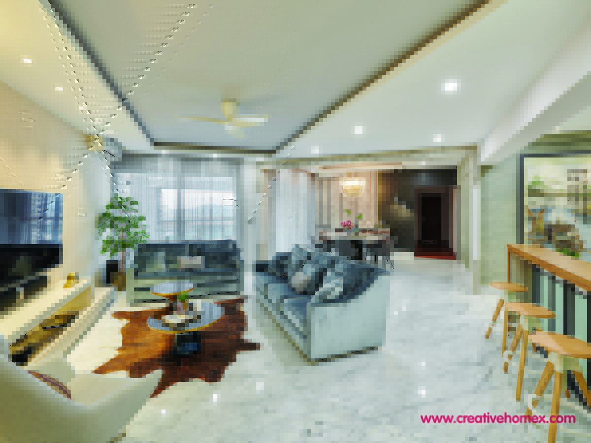 It takes a well-composed concept to achieve a residential design with fashionable taste of this magnitude, like this home exemplifies. Each room features its own unique set of colour themes and materials, but at the same time, they are immaculately complementary to one another. The living room is infused with a sense of cosy luxury thanks to the tailor-made TV cabinet and velvety upholstery which infuse a bespoke atmosphere to the space. A brown carpet under the pair of round coffee tables keys in a personalized effect while a solo armchair on the side harmonizes with the overall interior outlook.
