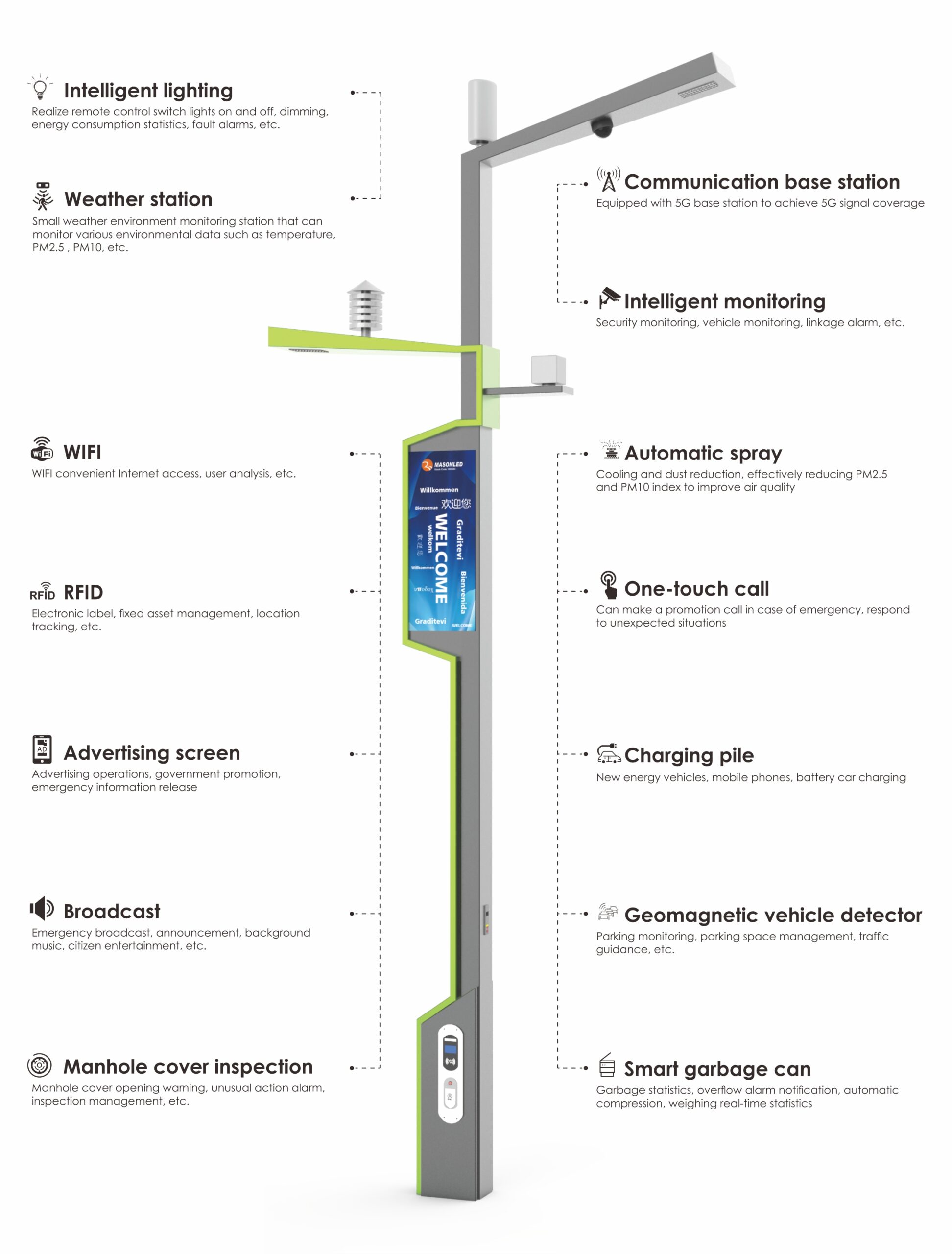 More than light — a connected ecosystem. This integrated solution combines lighting with surveillance, EV charging, Wi-Fi, emergency alerts and digital signage. It demonstrates how urban illumination can power smarter, safer, more connected cities.