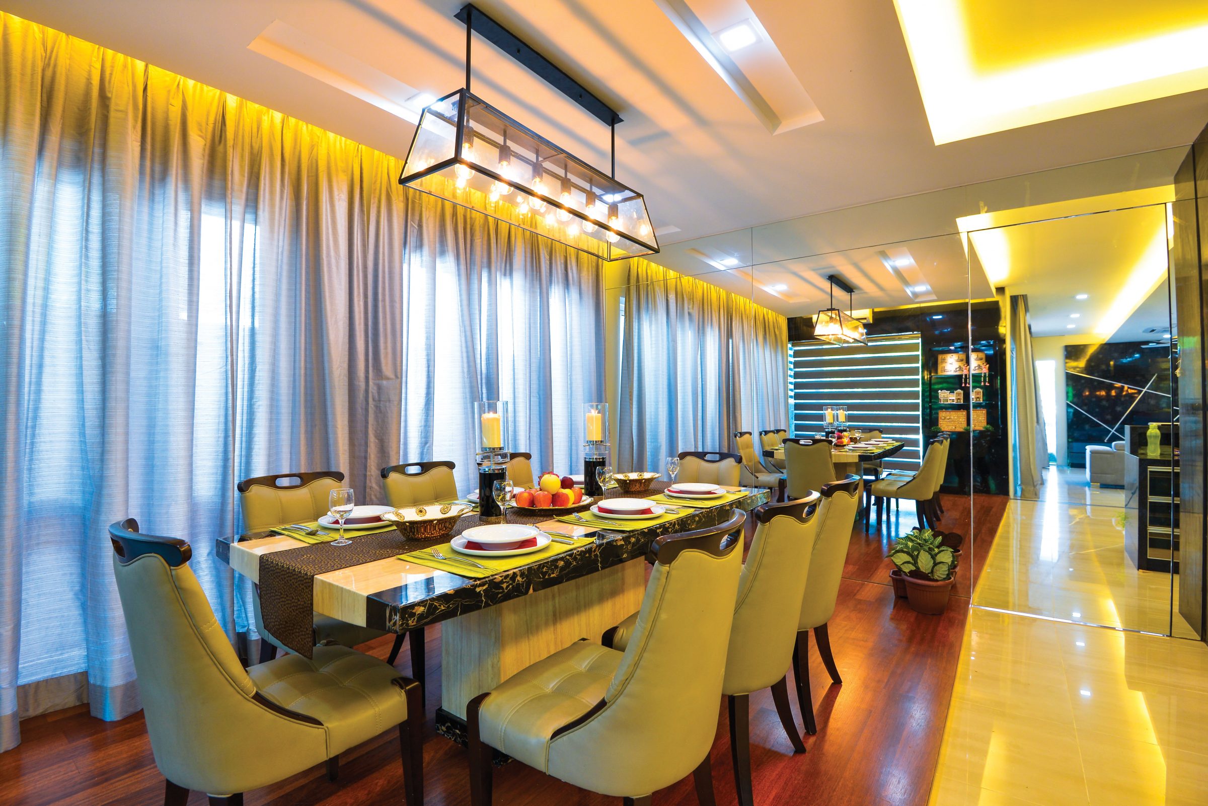 Few materials can match the gift of opulence that comes with a seamless slab of marble, and few pieces of furniture entail a horizontal stretch as generous as the typical dining table—which goes a long way toward explaining why dining surfaces from antiquity to modern times have been almost exclusively composed from dramatically veined or speckled stone. In the shimmering environs of the pictured dining space, a decadent slab of black marble with white veins is selected by Zanotta Studio Design and Renovation, to complement the champagne and gold tones of the space.