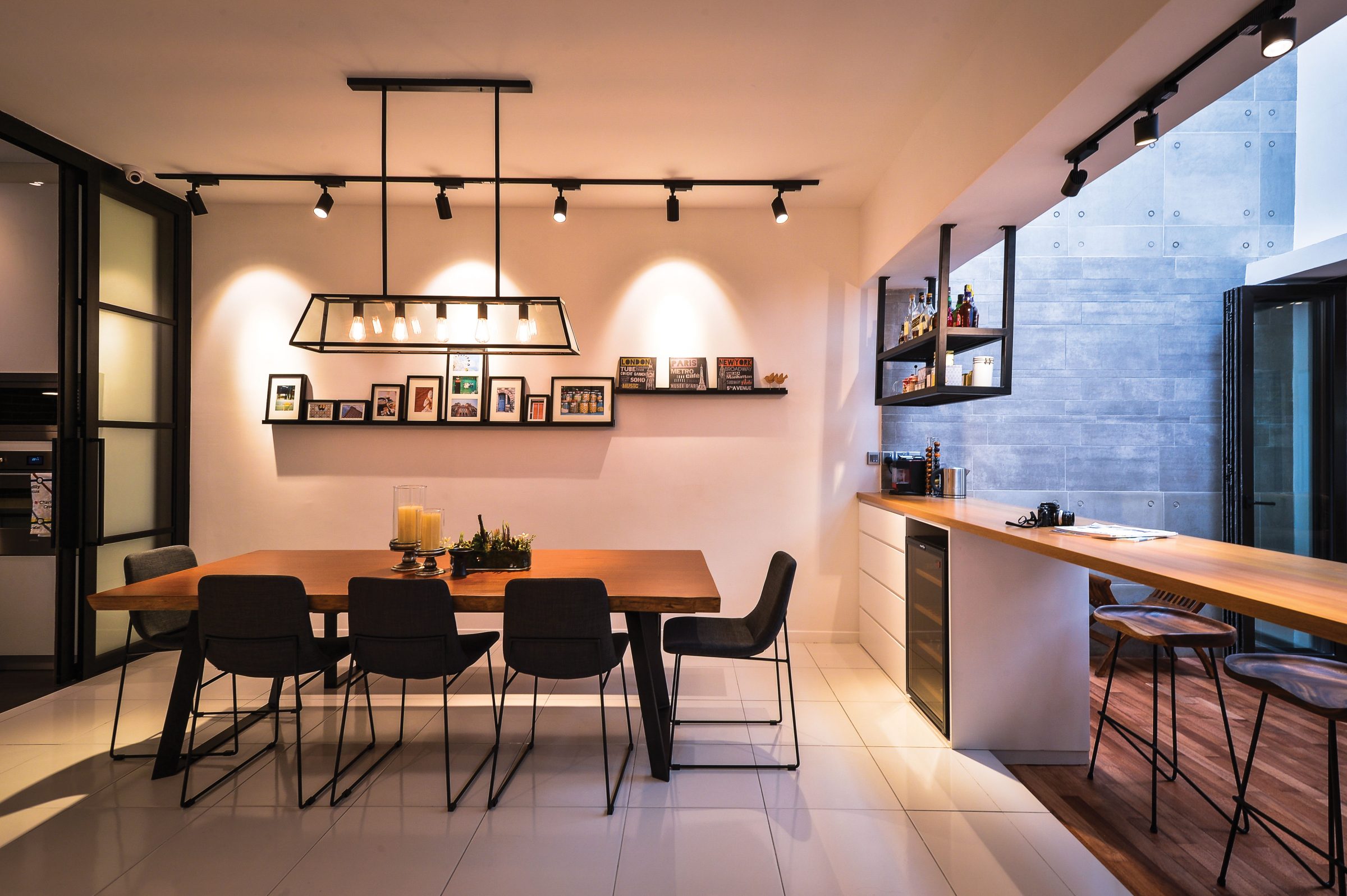 Following in the wake of the abstract works from artists such as Jackson Pollock, is minimalism — the school of aesthetics which seeks to strip everything down to the bare essentials, to reinforce purpose and practicality with sleek, uncomplicated, and space-saving forms. A table of minimalist design is preferred for providing functionality while retaining a sense of space in a compact dining area. In the pictured dining space decorated by Yong Studio, the selection of a table embodying minimalist style matches the surrounding architectural finishes and buries the arrangement in a background of complementary tones and textures to preserve space.