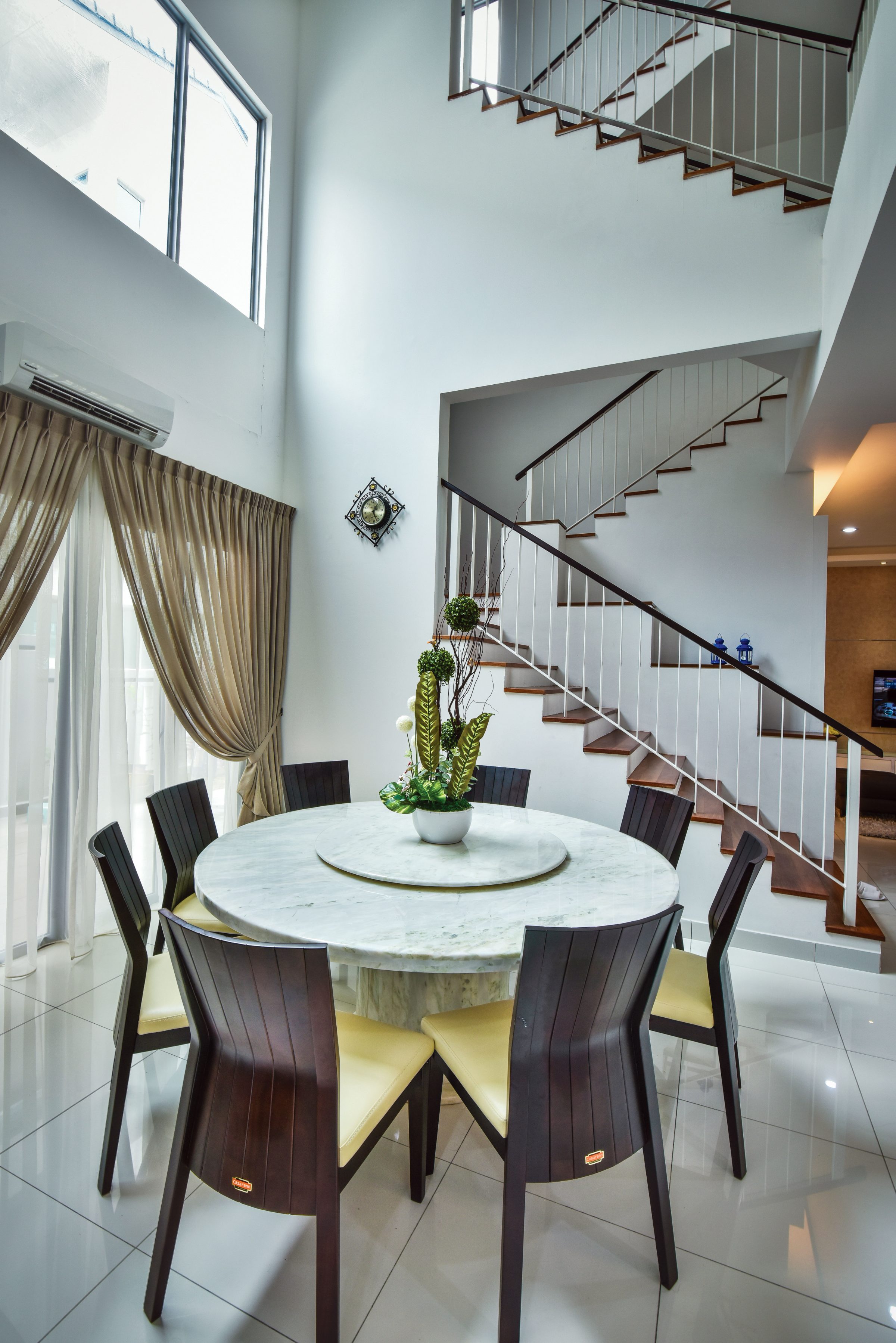 While rectangular dining tables may appear empty with some chairs removed, a circular dining surface presents itself as the more versatile choice as its appearance will remain complete whether hosting a full accompaniment of chairs or a sparse arrangement consisting of only a few seats. Due to the greater area that circles entail, the circular table is preferred for wide spaces that leave plenty of room to manoeuvre. The pictured dining area features a circular table with space for up to eight diners, a number that would not be as comfortably achieved with a rectangular table of similar size.