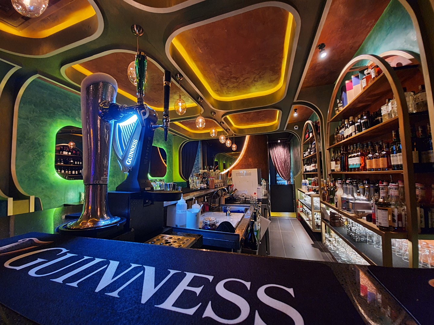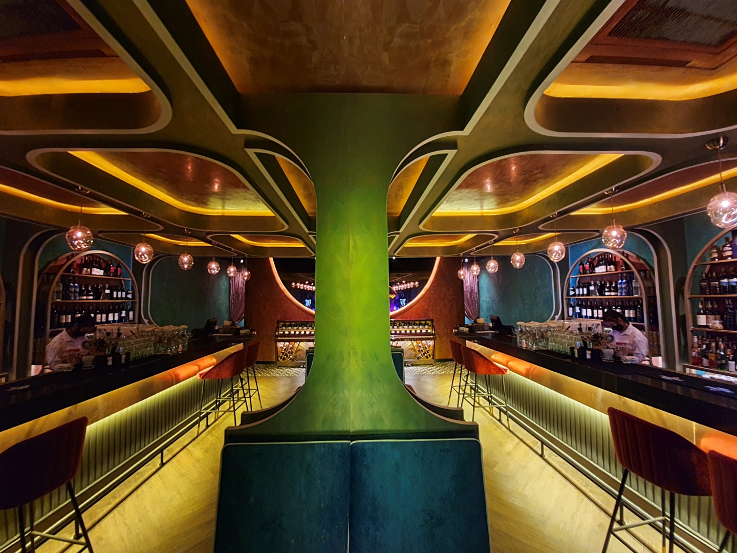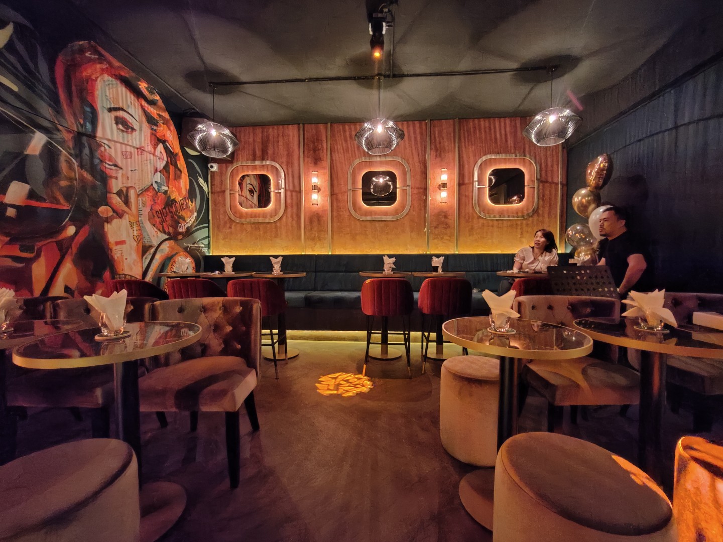 The interior features bold geometric forms, gleaming metallic finishes, and rich autumn hues deep burgundy, burnt sienna, and opulent gold. Wall-sized murals add depth, while plush velvet sofas offer indulgent comfort. Electro-swing rhythms set a refined yet energetic ambiance, evolving with live performances by local artists. A testament to Q1 INTERIOR CONCEPT SDN BHD’s exceptional design, Sip Society is an urban sanctuary where guests sip, savour, and celebrate in style.