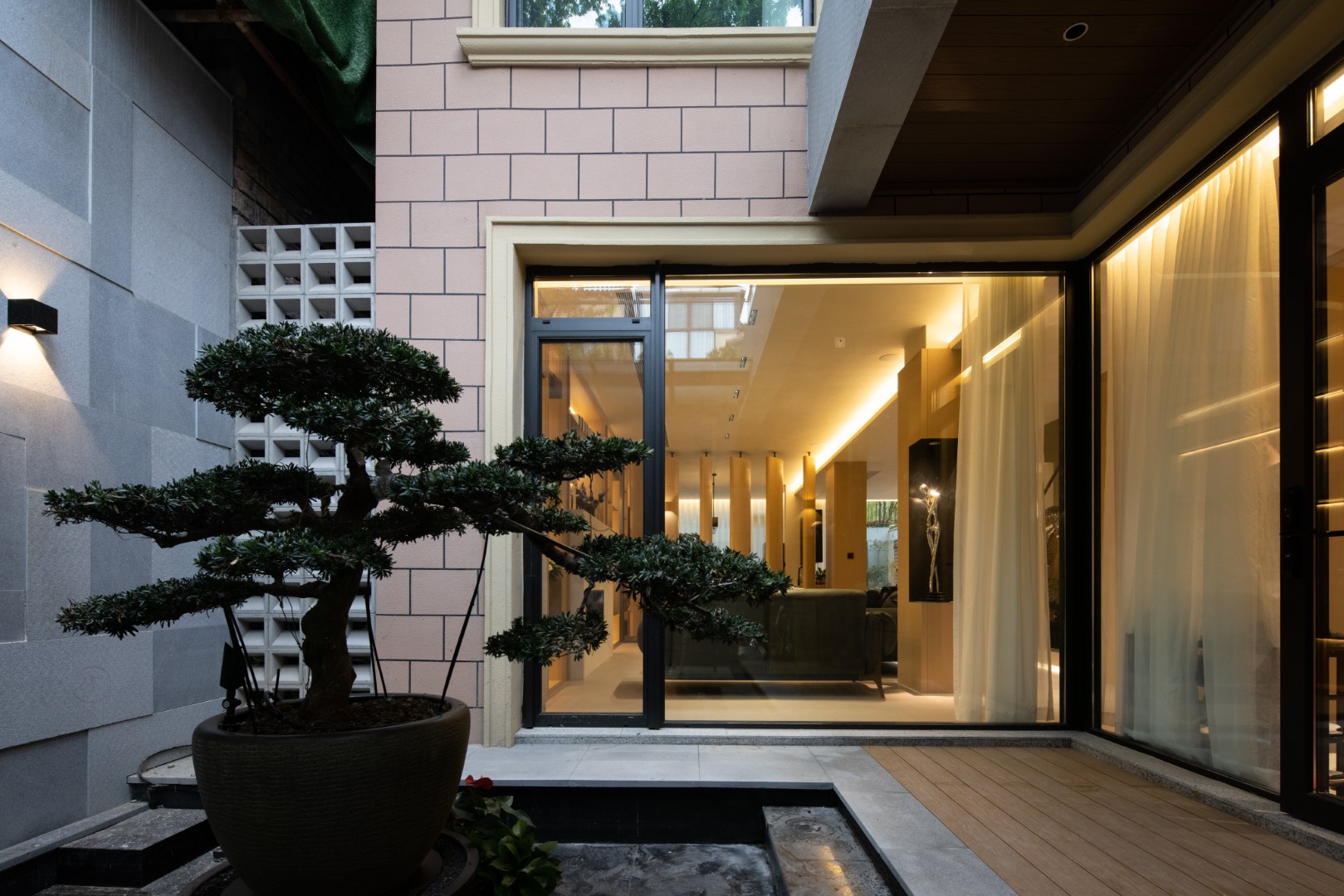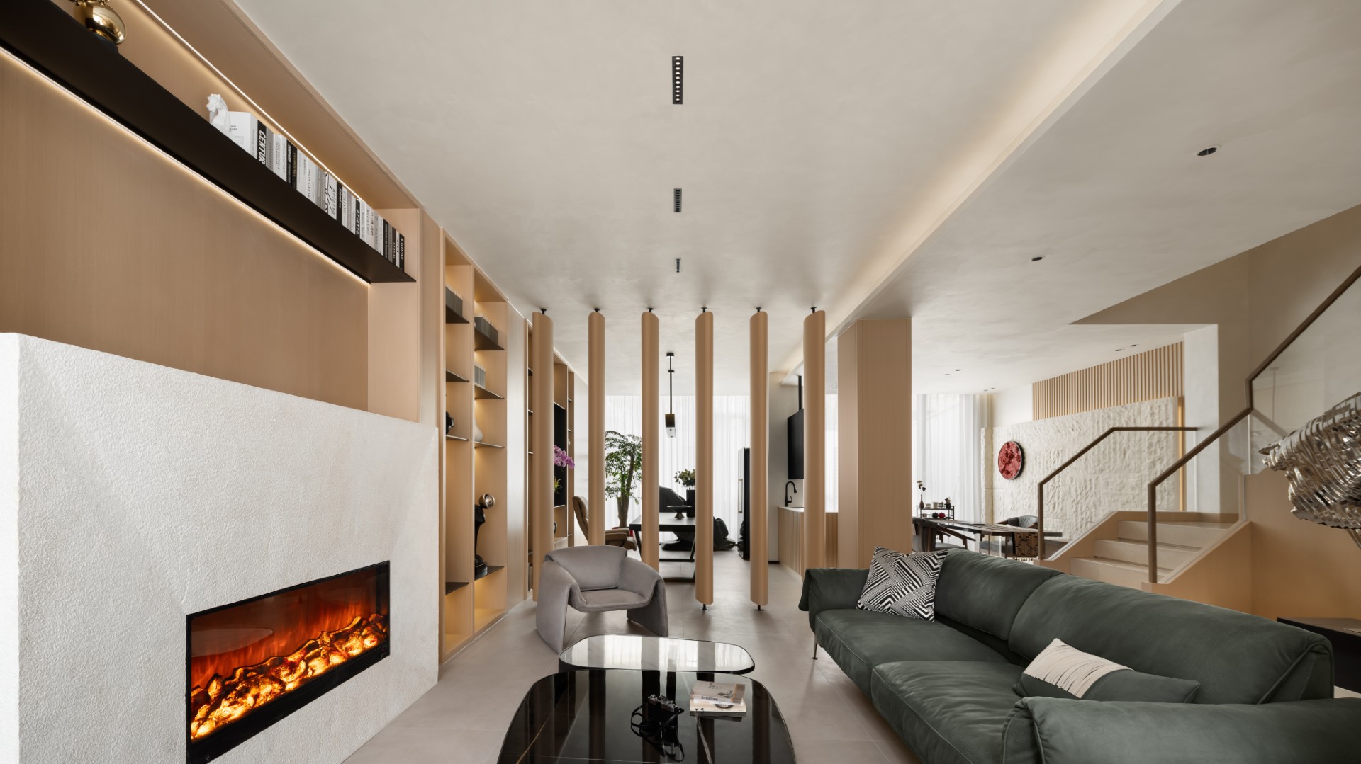 The basement includes a workspace, tea room, and dry landscape garden, with large glass panels framing lush greenery. The tea room offers a serene social setting, while the first-floor living room, with stone accents and a faux fireplace, balances movement and stillness. A winding garden path ensures privacy while evoking a traditional courtyard. The children’s rooms reflect their personalities—an astronomy theme for the son and a dreamy, animal-filled retreat for the daughter.