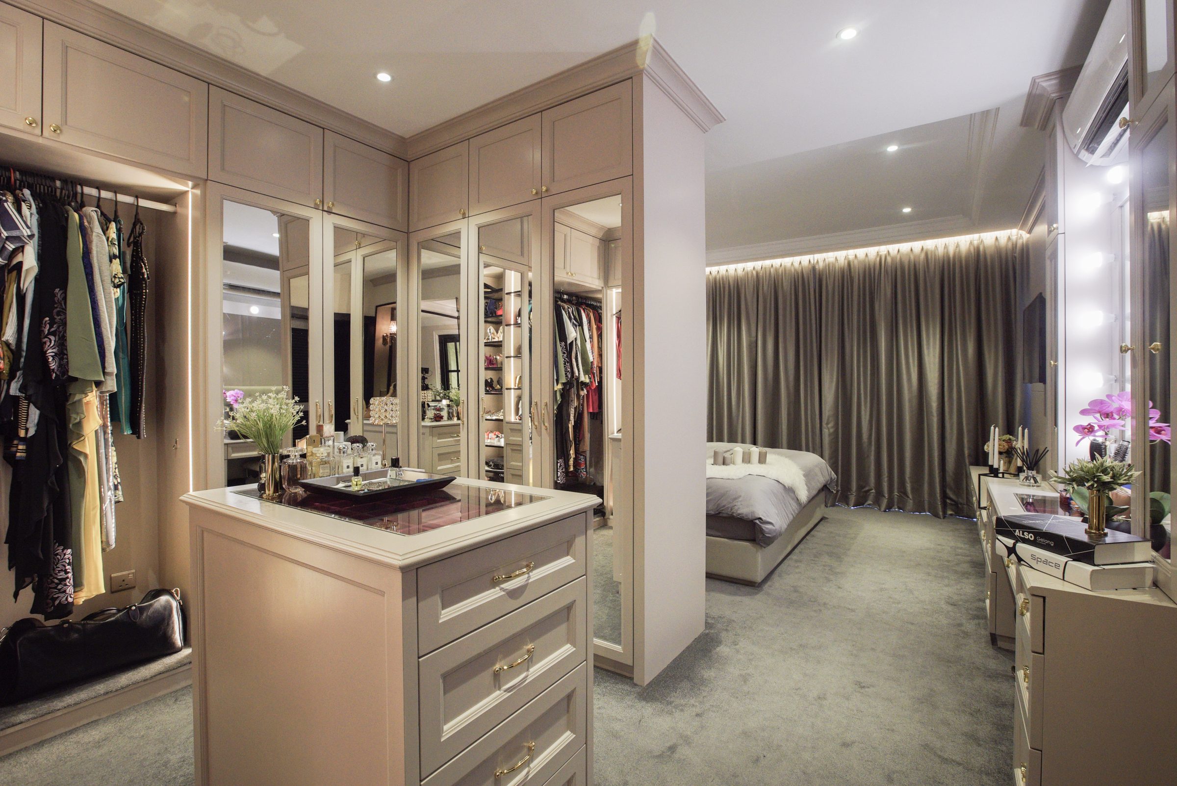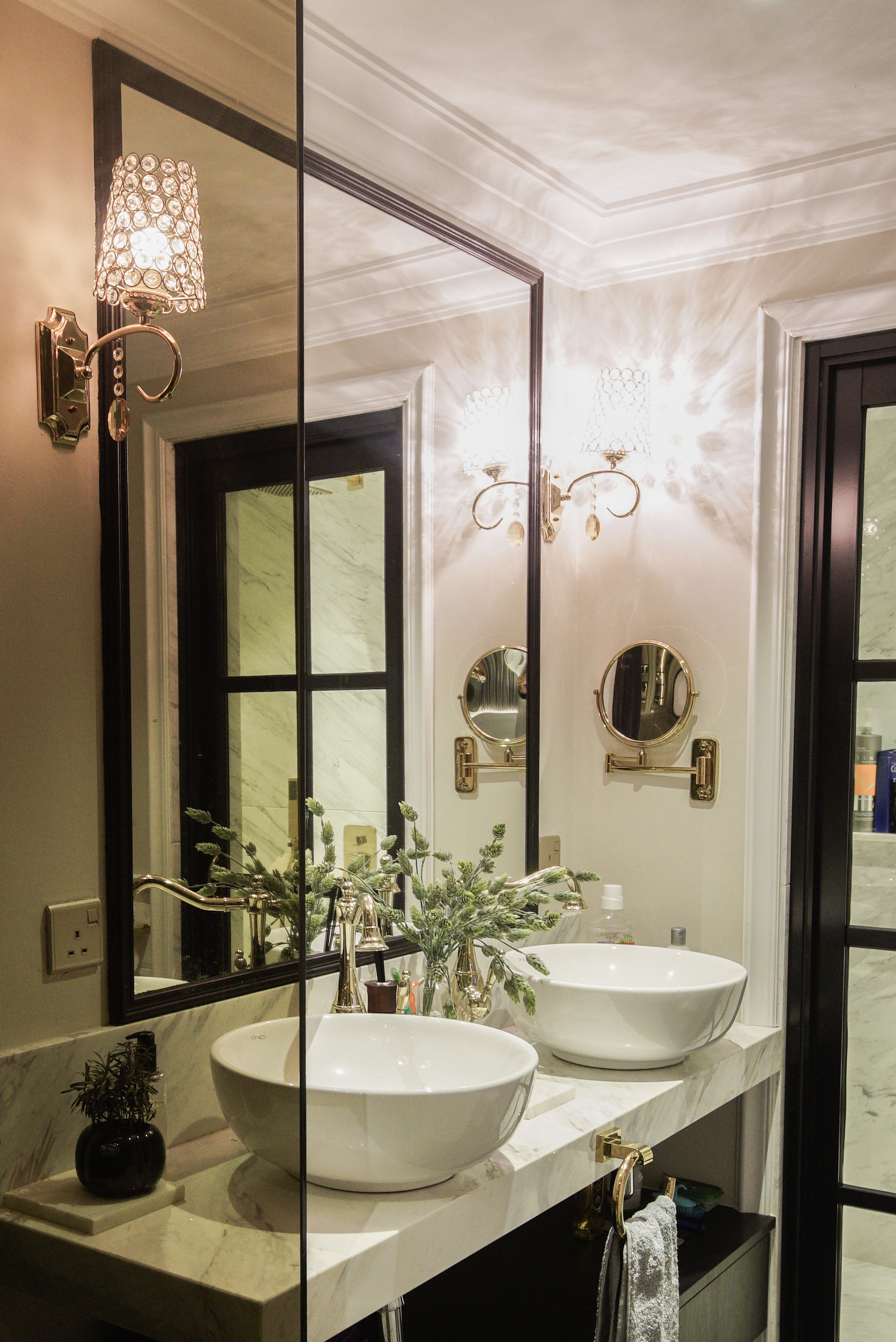 The classic wall treatments extend to the walls of subtle beige in the master bedroom, with shaded wall-mounted lamps and plaster ceiling moulding adding to the luxurious vintage vibe. The classic blends with the modern in the button-back upholstery of the headboard being flanked by the pair of reflective bedside tables. A significant portion of this bedroom is dedicated to wardrobe space, with a long dressing table running from the full height tinted glass wall separating the bathroom from the bedroom to the foot of the bed.