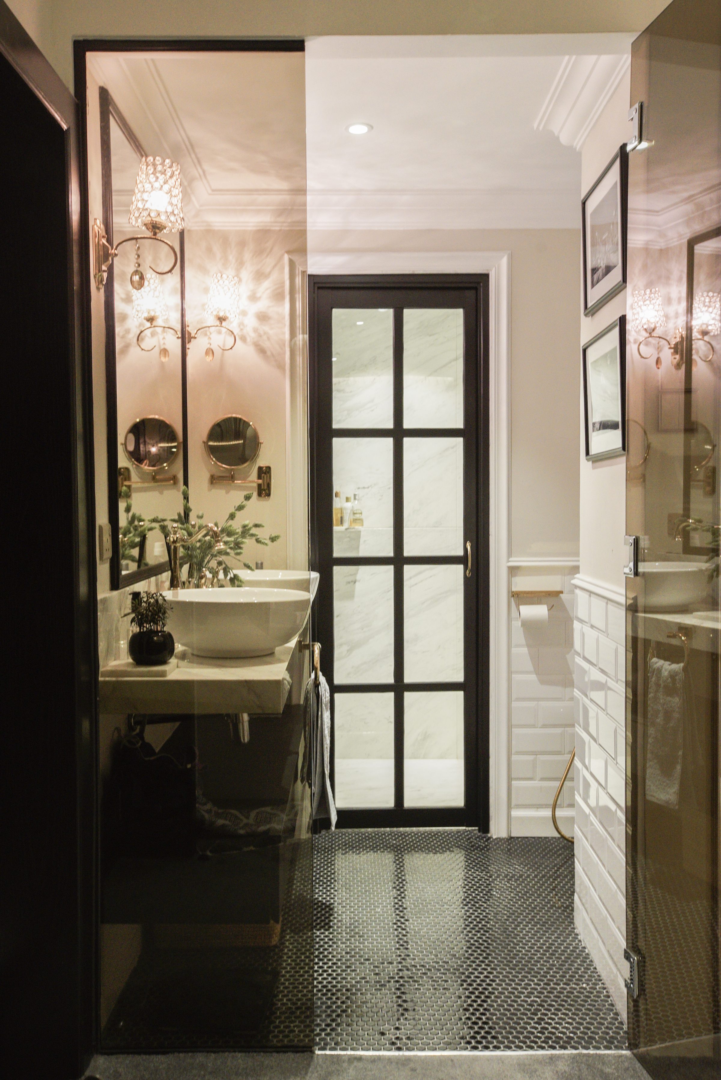 A pair of modern bowl-shaped vessel sinks is mounted on a counter of white marble in the bathroom and illuminated by two shaded lamps attached the wall on either side of the bathroom mirror. A subtle addition of feminine grace is introduced with the bright white of the bathroom lamps taking on a shade of rose gold when observed through the dark tint of the glass wall.