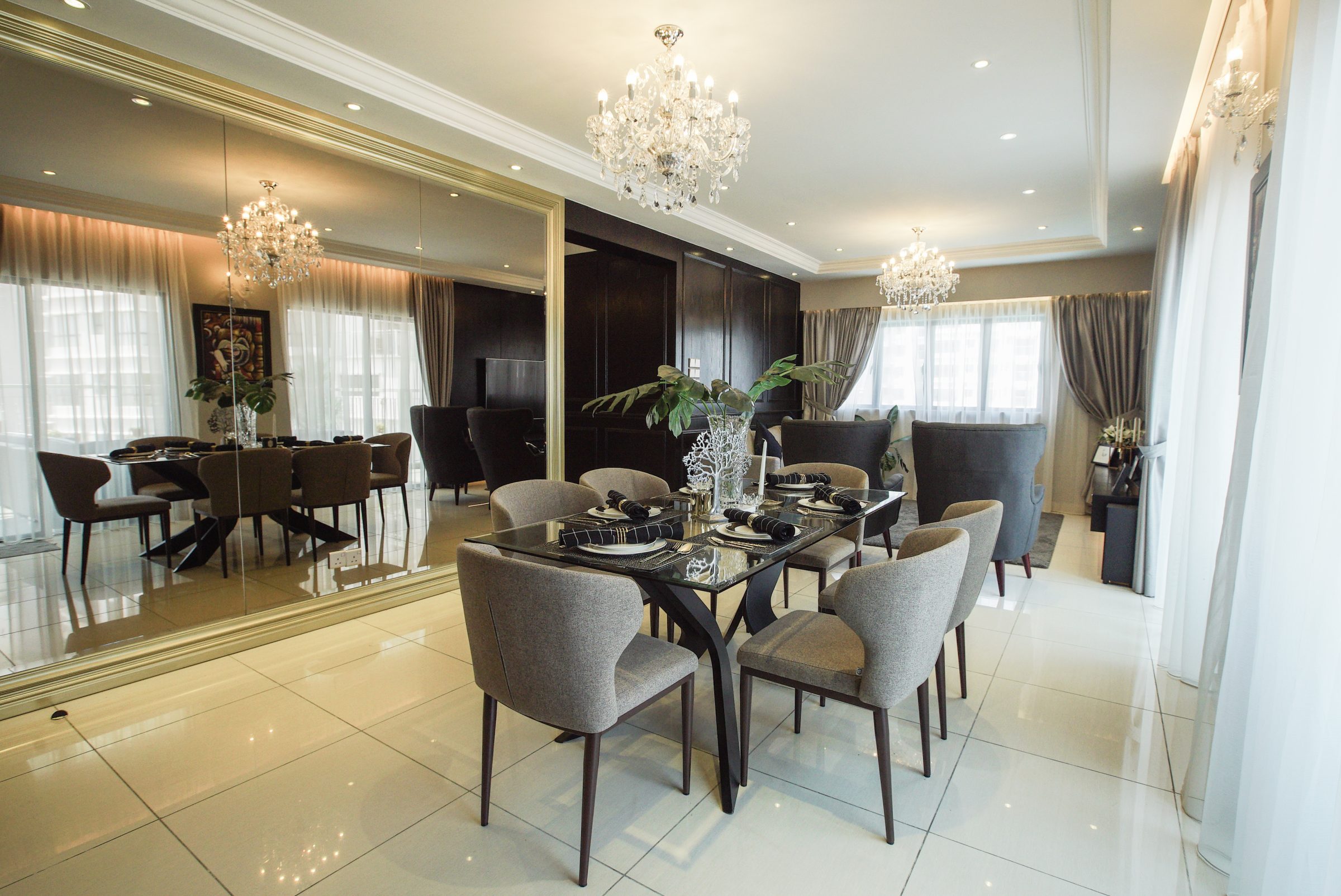 The dining space overlaps with the foyer, consisting of a modern glass-topped dining table accompanied by fabric dining chairs with winged backs in grey. An intricate crystal chandelier is raised above the dining surface, its grandeur reflected by the mirrored wall. The mirrored panels on the dining room wall are framed in golden trim, adding a thick layer of luxury to this space and obscuring the hallway to the kitchen behind it.