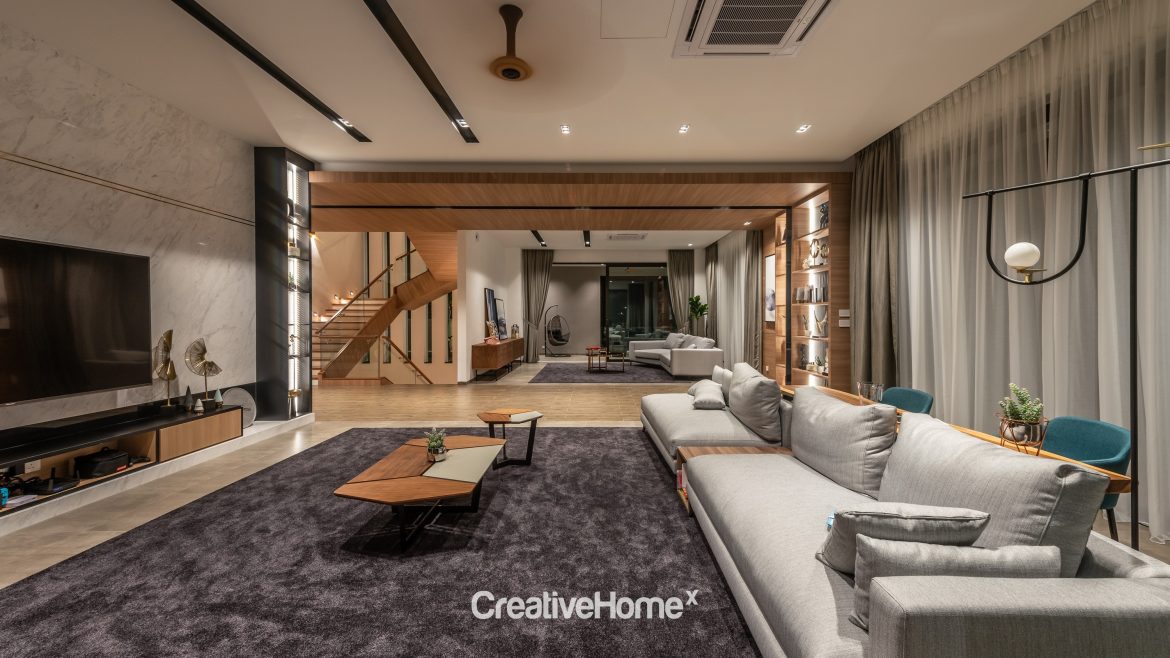 Wood and gold accents, lush textures, an ultra-cosy palette – these key elements are the highlights of this 8,000 sqft bungalow designed by Nu Infinity. However, there is more to this home than meets the eye. Within each space, a unique ambience is perceptible where a harmony of forms and features becomes the foundation of a distinctive interior concept.