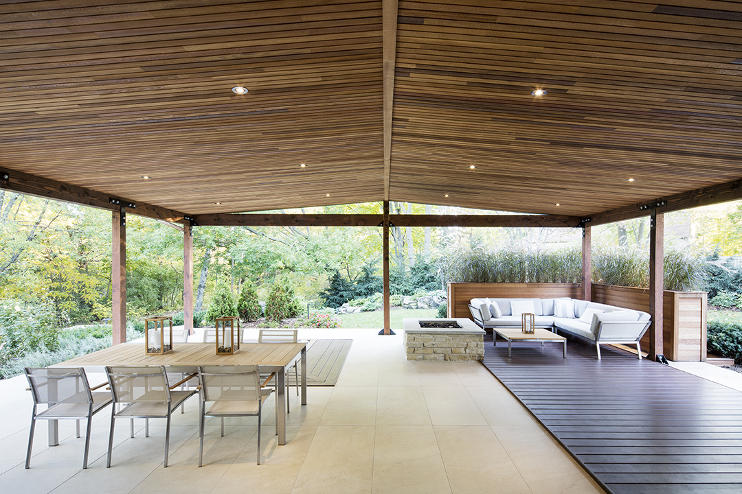 The mix of stone, masonry and wood in the transformation of this latter terrace is very much in the style of the original house. To enhance the warm feeling of its cedar ceiling, the existing steel structure was replaced by a structure of solid cedar. Cedar posts and screens with insertions of stained cedar unite the wood ceiling and the ceramic floors.