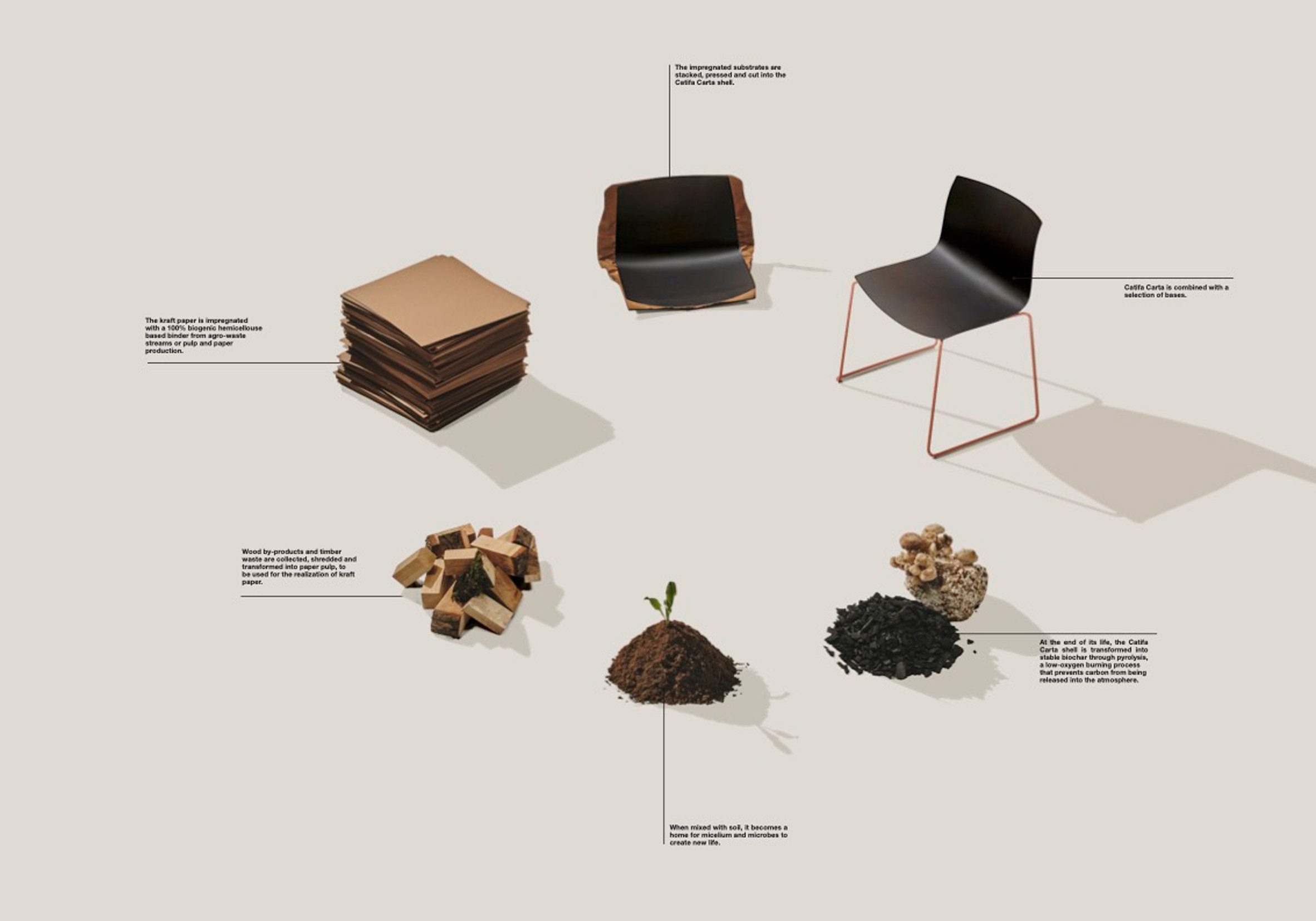 The shell is formed from 29 layers of compressed recycled paper, with raw material sourced from discarded wood residues. Importantly, the manufacturing process excludes conventional chemical adhesives: the product relies solely on natural hemi-cellulose as the binder. At end-of-life, Catifa Carta can be thermally processed into porous biochar, which can then be returned to soil to support reforestation demonstrating a “from nature, back to nature” circularity.