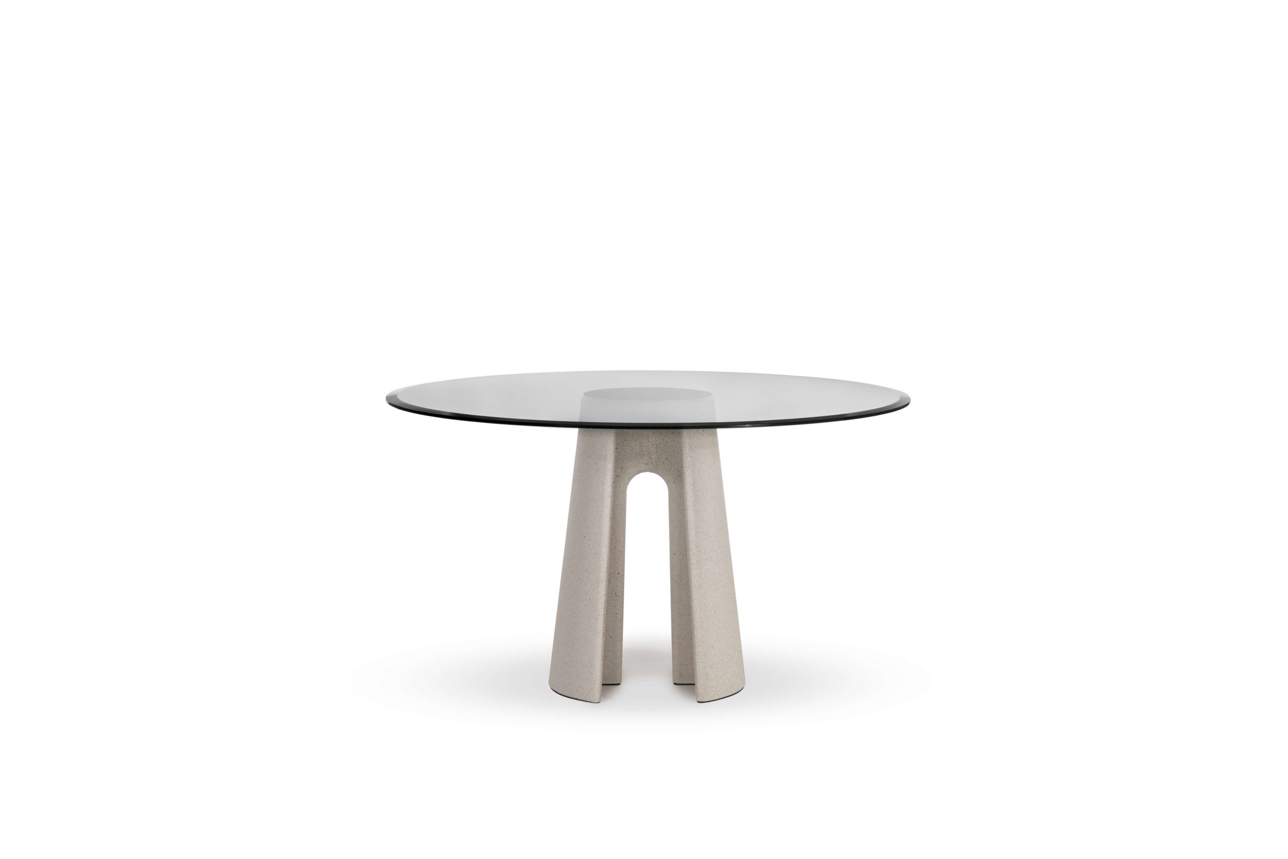 Pied-à-terre by BrogliatoTraverso, a round table that combines geometric clarity with functional adaptability. Available in both fixed and extendable versions, the design emphasises conviviality through its circular form, while a recycled marble ballast at the base introduces a strong graphic element.