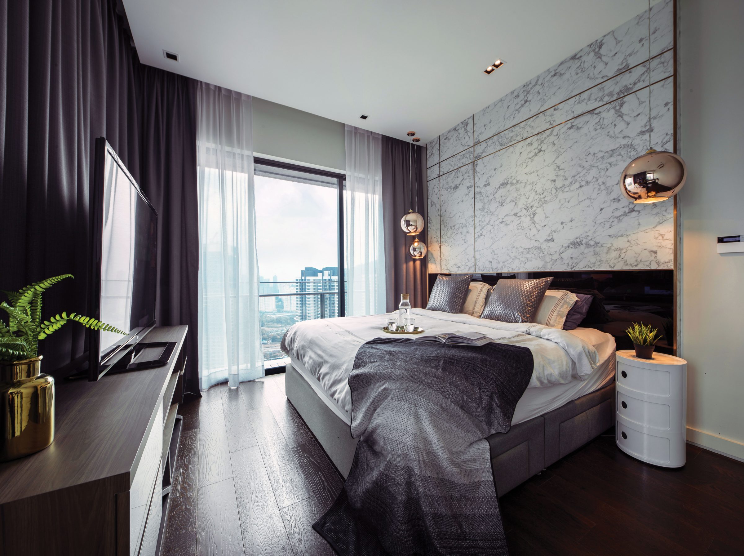 While the grey on white stone in the seating lounge is reminiscent of the Calacatta variety of marble, the feature wall of the master bedroom presents a similarly white stone with grey speckles for differentiation, with the use of polished bronze trim repeated to section the panel of stone into art deco proportions. Hanging on either side of the bedframe, a trio of Tom Dixon’s copper-plated mirror ball pendants provide a whimsical measure of contrast against the straight lines of the decorative panel.