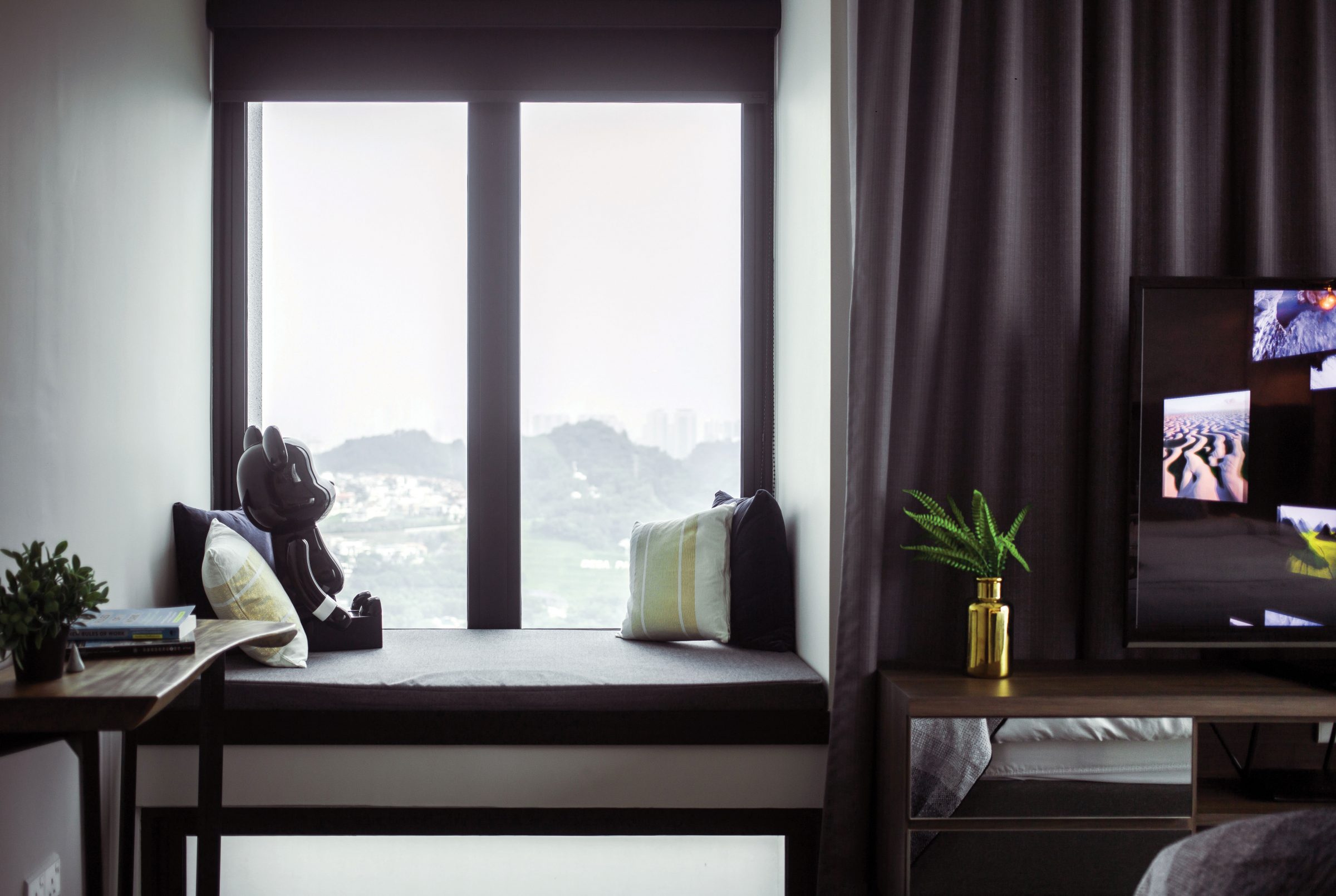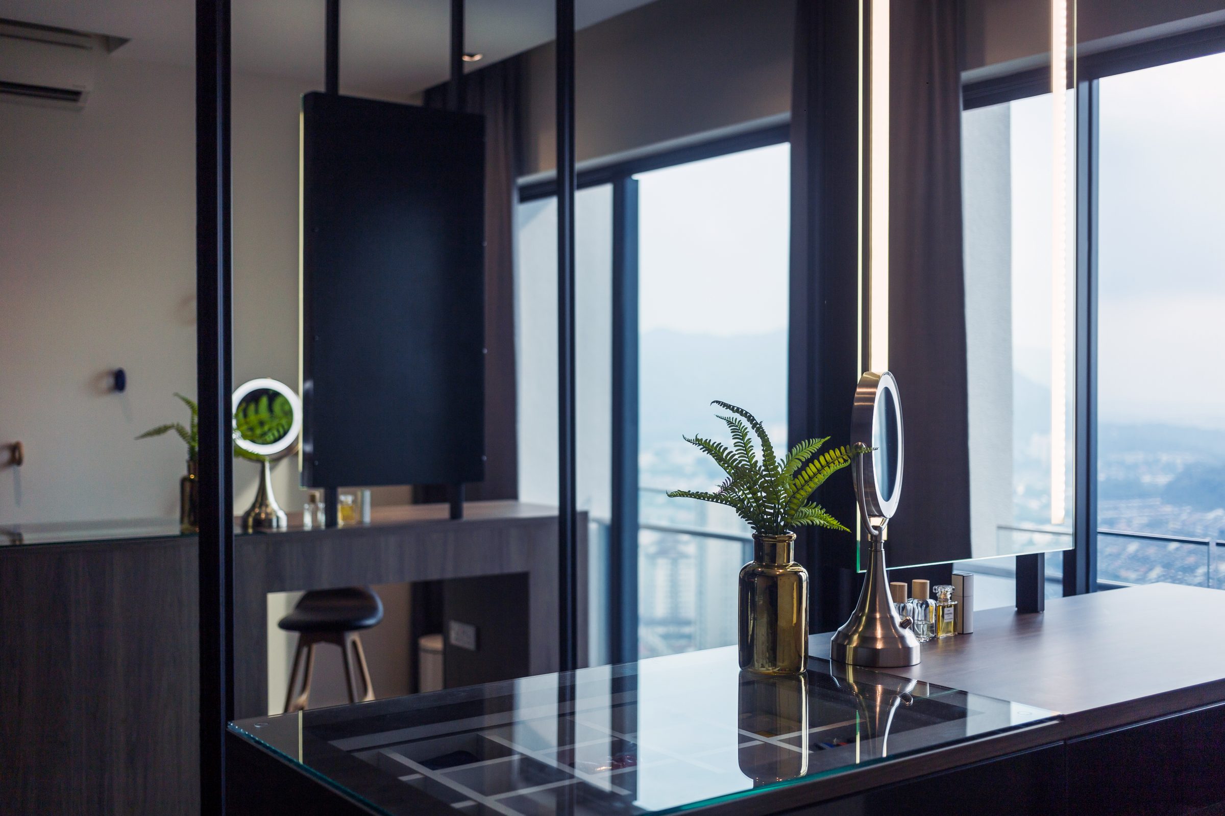 In one of the other bedrooms, a dressing table projects from the dark wood floor to carve out a section for use as a walk-in wardrobe space – the resulting visual obstruction is bypassed and access to the generous view is provided by way of the mirrored wardrobe doors.