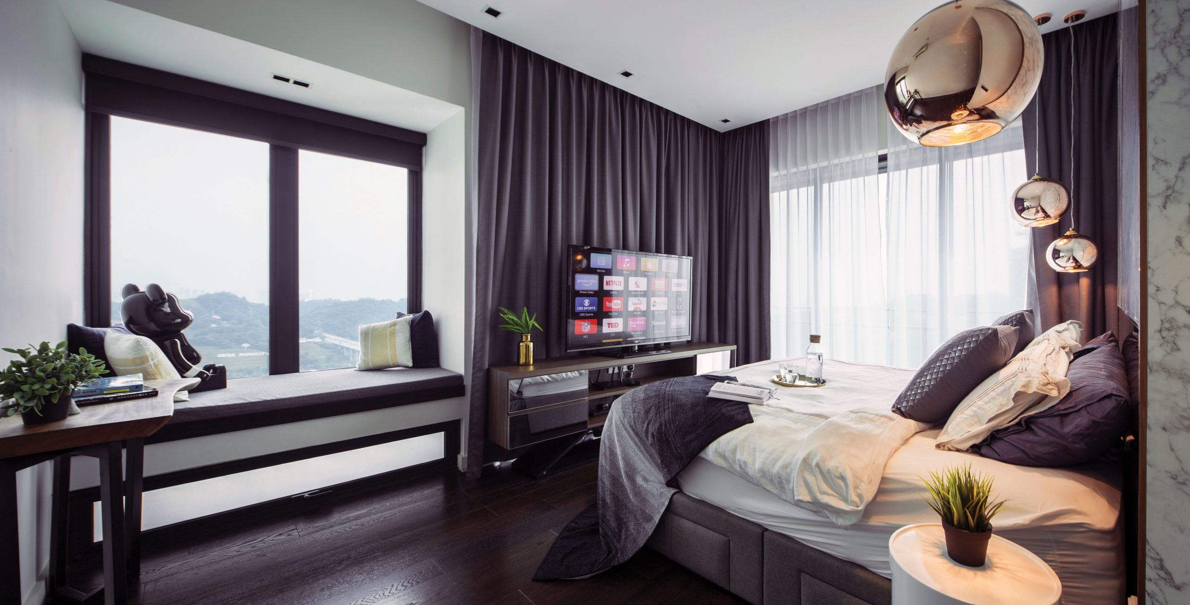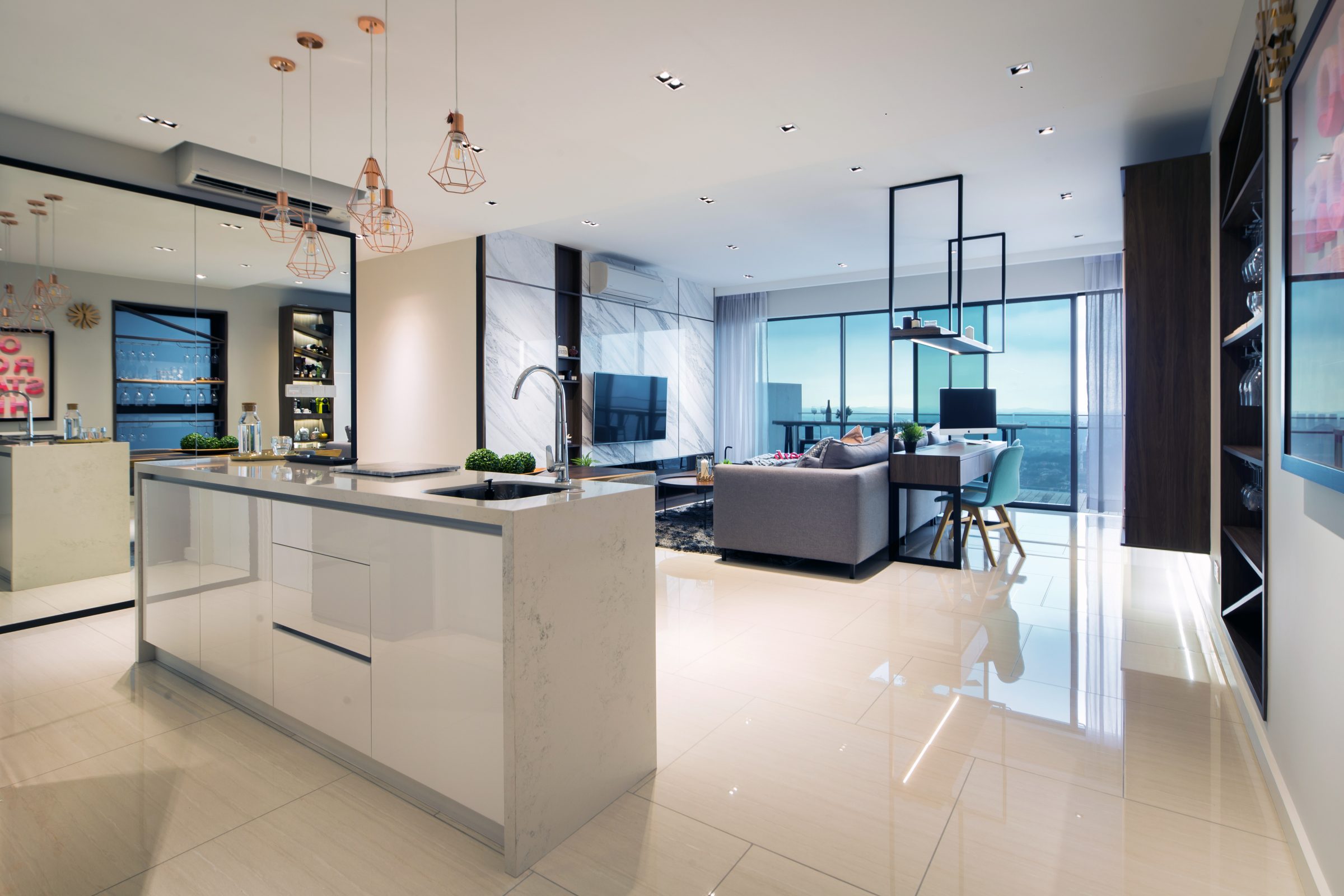 Amidst furnishings with narrow black frames and modern lighting fixtures of copper, Nu Infinity elevates the decidedly minimalist décor of this compact condominium with generous swathes of marbled stone and polished bronze trim. The perspective from the foyer presents a near-uninterrupted panoramic view of the outdoors, facilitated by ethereal drapery hanging over tinted sliding glass doors, low-profile furniture, and an array of black square pipes that make up the enviable home office situated at the rear of the seating lounge.