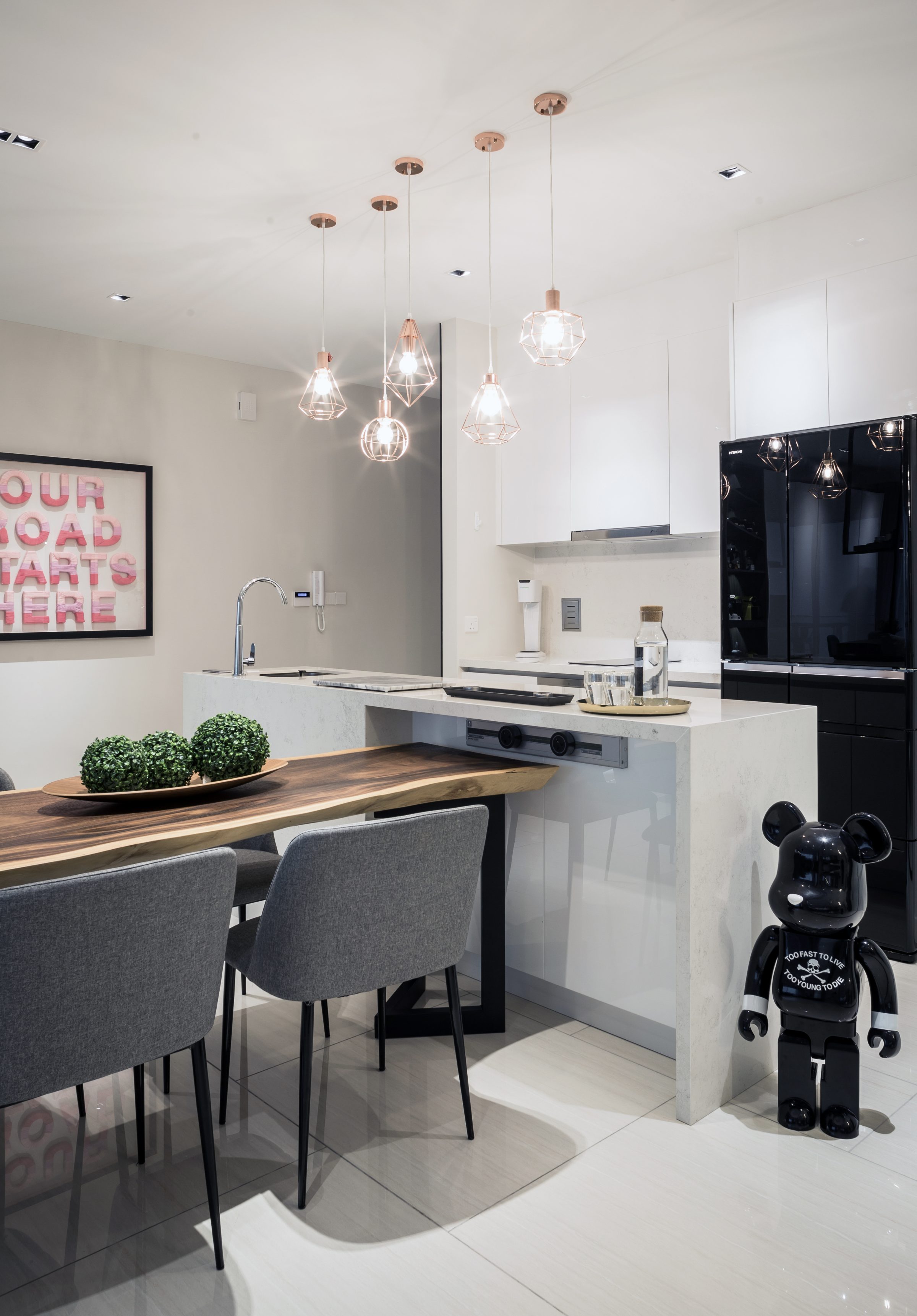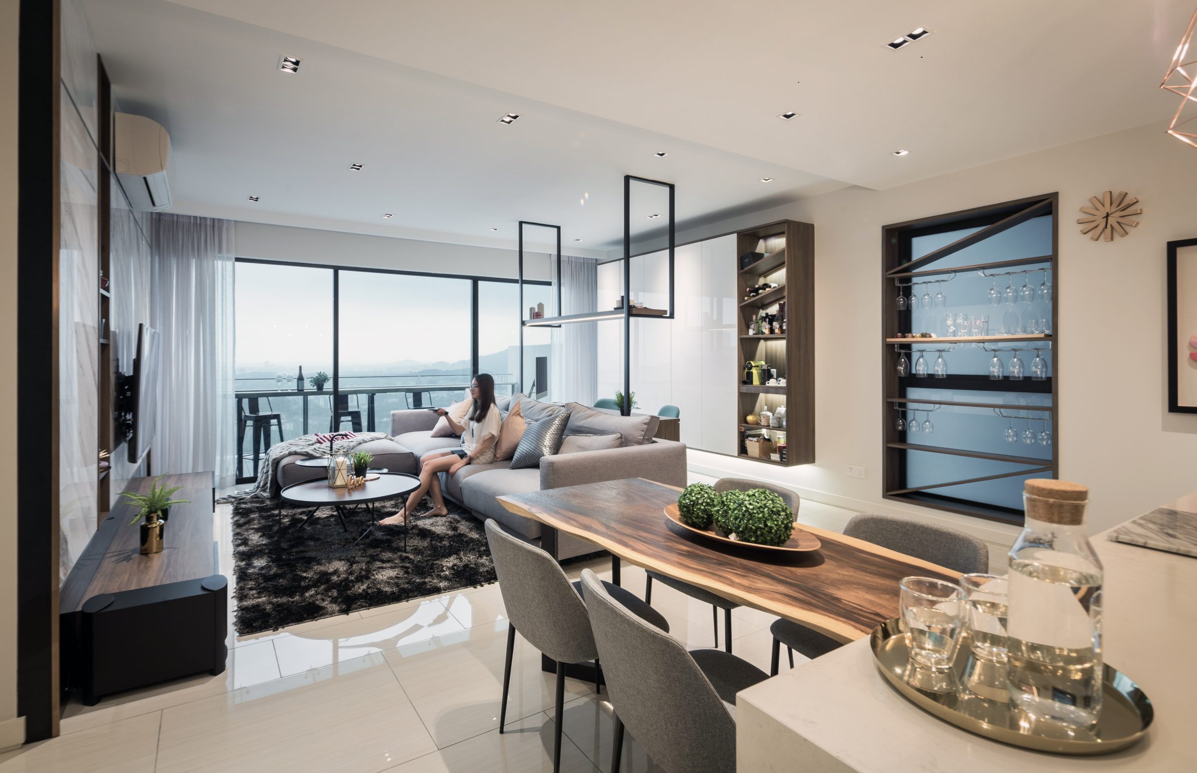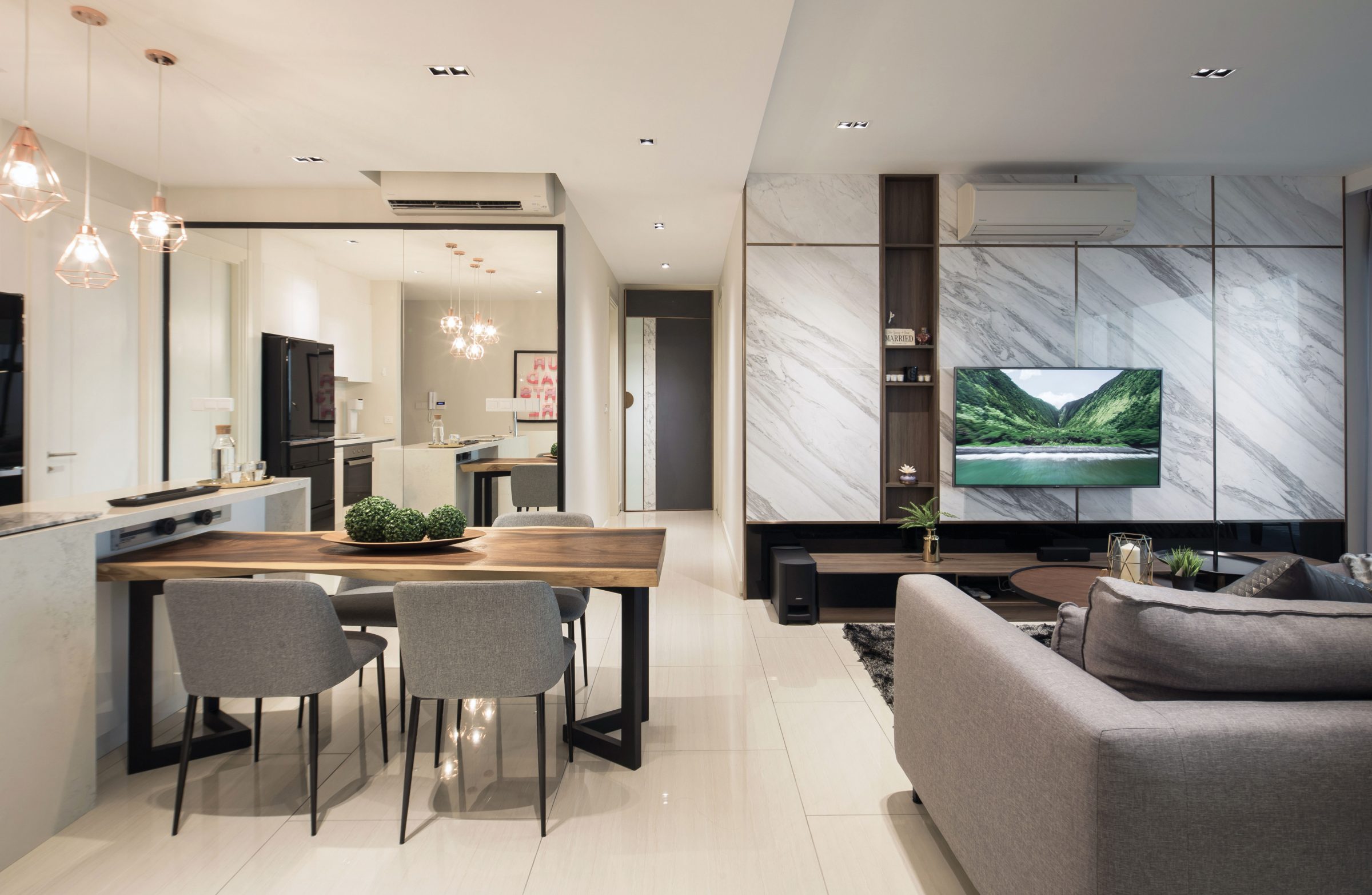 Earthly Overtones: Attention is drawn to the patches of natural materials distributed about the open layout: a serving platter of stone is mounted on the kitchen counter to echo the linear grey veining on the entertainment wall, while the various shades of wood converge on the dining table.