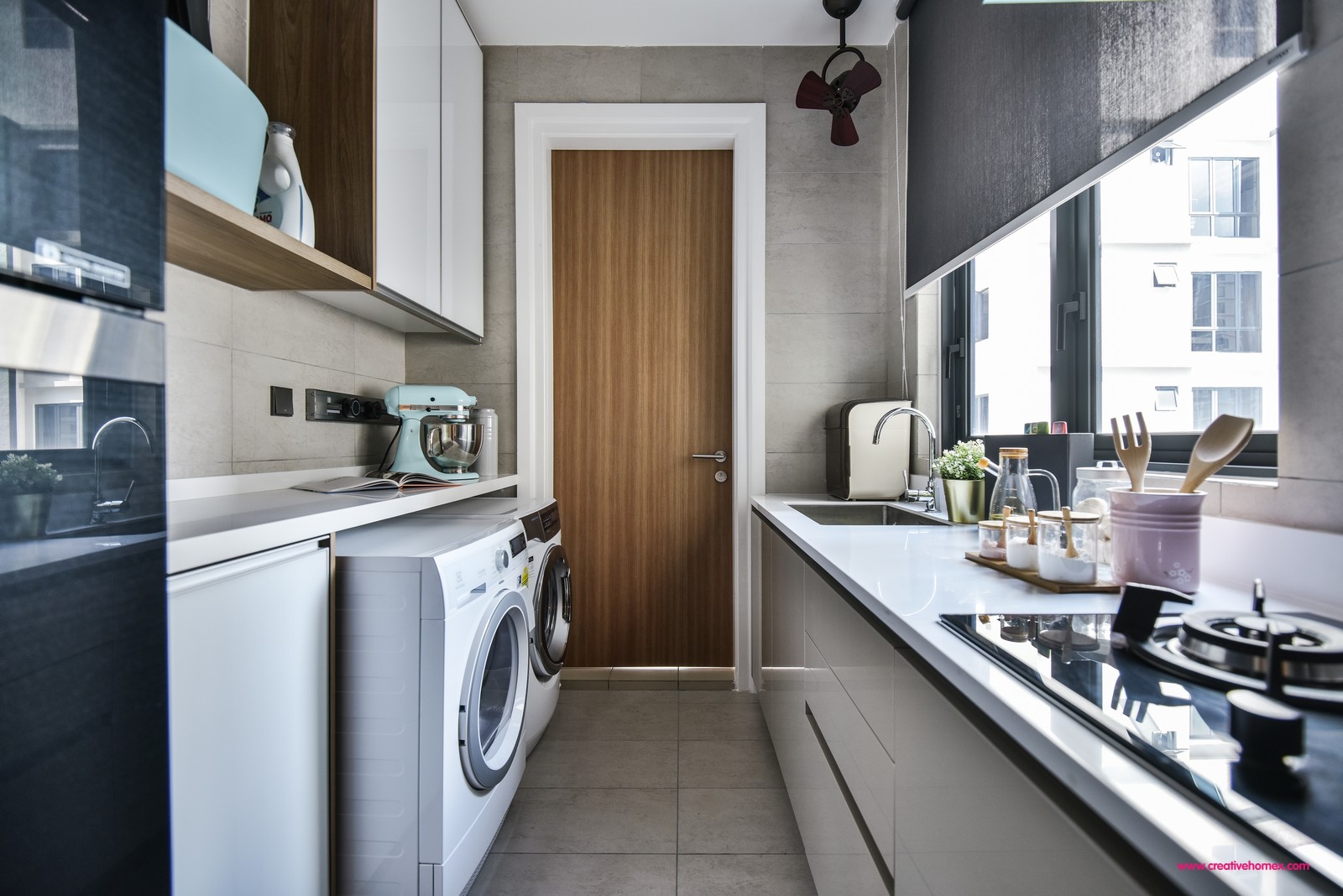At the dining area, the timber slab dining table makes an excellent conversation piece. Surrounded by cosy wood-framed chairs, the setting is warm and welcoming. With the adjacent kitchen next to it, done up in sleek creamy white surfaces, a pleasant feeling ensues, making one feel completely at home. The owner also included a wet kitchen – a truly functional space that incorporates a laundry area next to the cookspace. The space receives ample natural light from the windows, creating a bright space to do chores in.