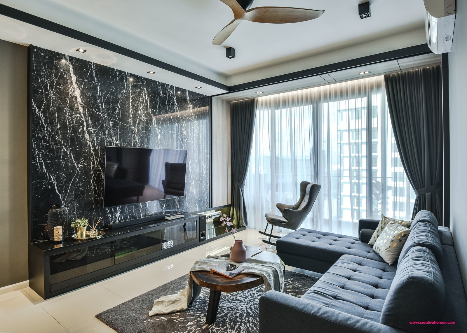 The serene feeling begins at the front door that opens into the chic living room where the marble feature wall and dark-coloured sofa are seen. A dark-coloured rug is used to further infuse the effect, while a lone grey rocking chair towards the windows anchor in the cosy factor. The opposite wall is painted a warm grey tone to offset the other darker-toned features. Floors are kept to its original beige colour and doors are framed with white borders to add in a balancing contrast.