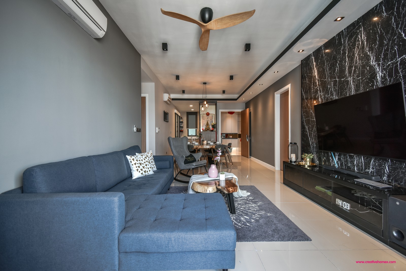 A sleek white-veined marble feature wall, cool blues for the bedrooms, and luscious shades and carpeting all around. While these features are seen in different spaces, the combination of these elements gives rise to a sophisticated yet tranquil atmosphere in this 1,788 sqft home.