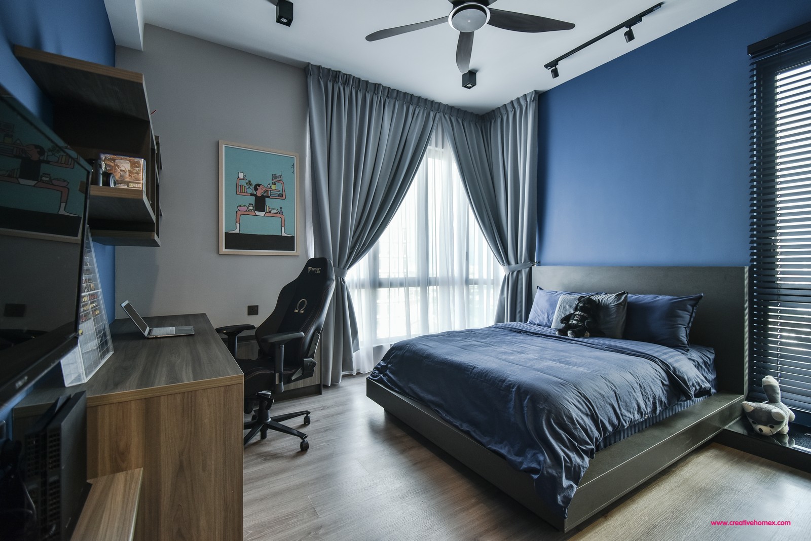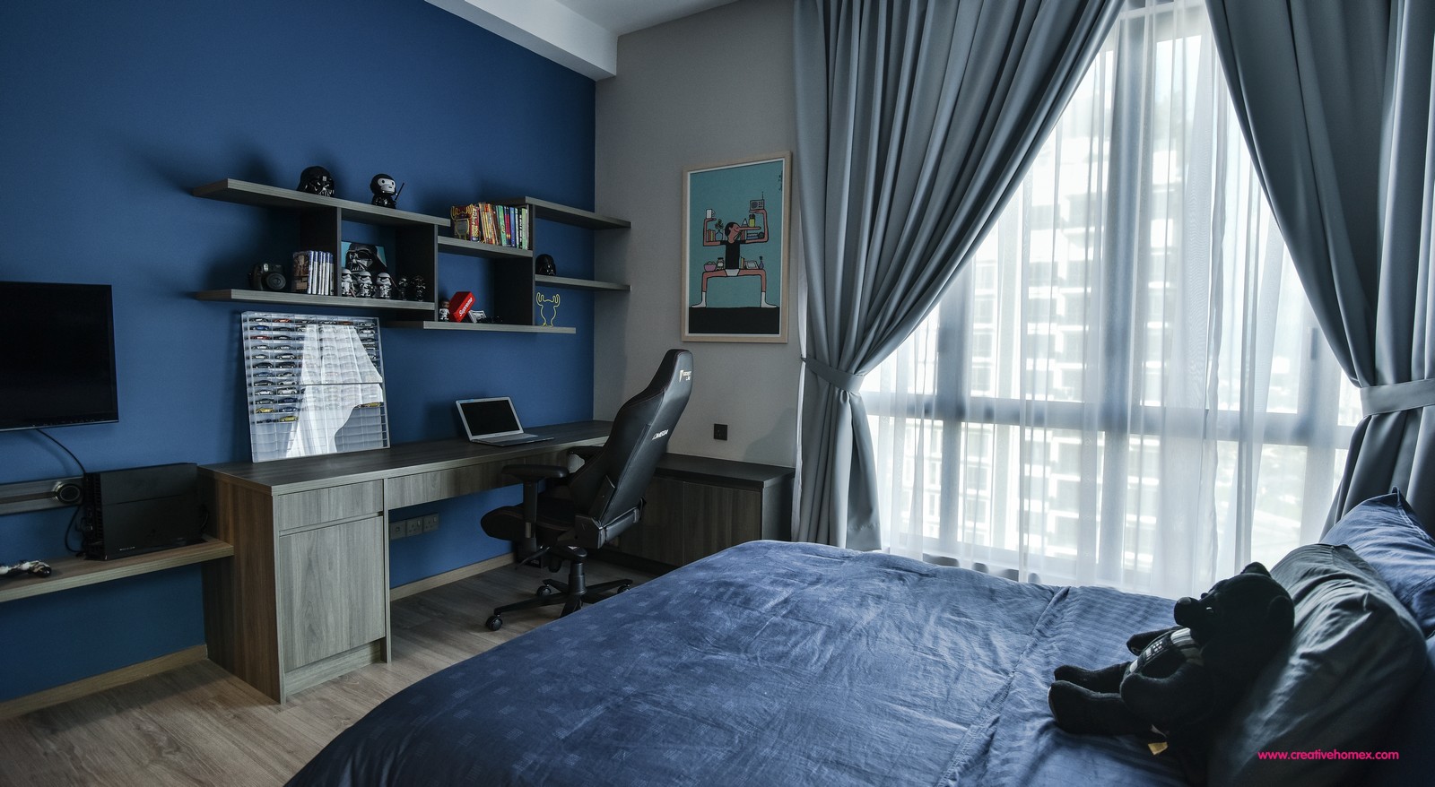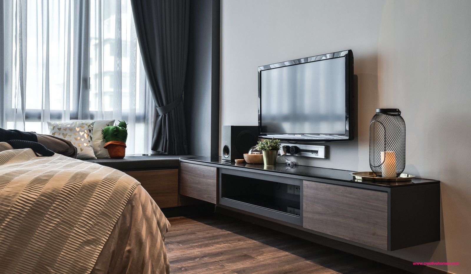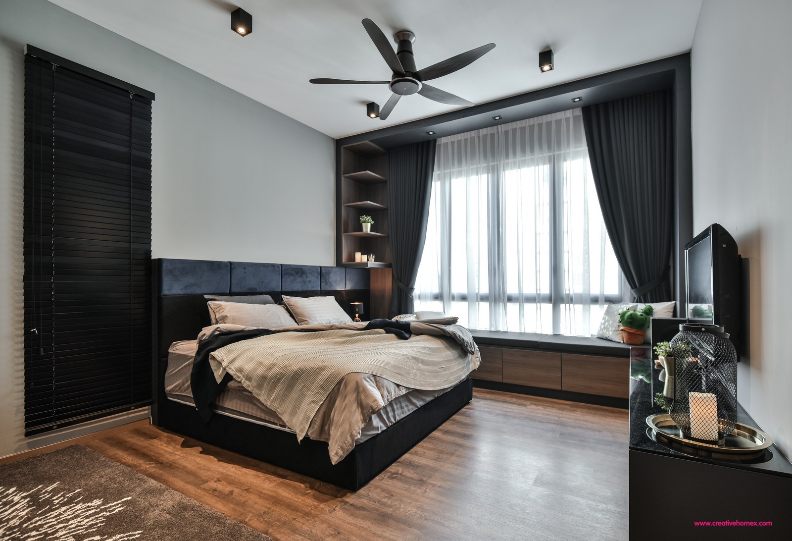The bedrooms are all furnished with a distinctive sense of cosiness using a cohesive palette. The master bedroom stands out with its black highlights and wood-dominant theme. The headboard matches the dark-coloured wardrobes while wood-toned flooring complements the TV cabinet and bay window seat.