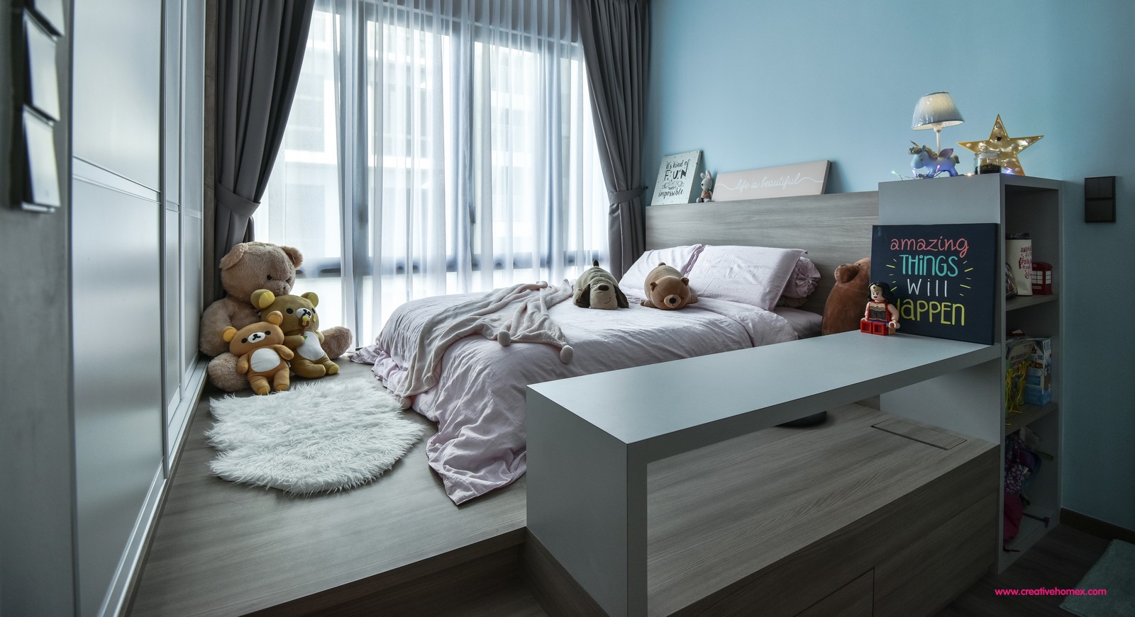 The second and third bedrooms, however, features two different shades of blue. The boy’s room uses a darker blue for its surrounding walls, enhanced further by grey drapes and blue bedding. The girl’s room is enhanced by different accessories against a backdrop of light blue. To create a sense of privacy, the designers placed the bed on top of a raised wood platform, resulting in a personal space that’s brimming with warmth.