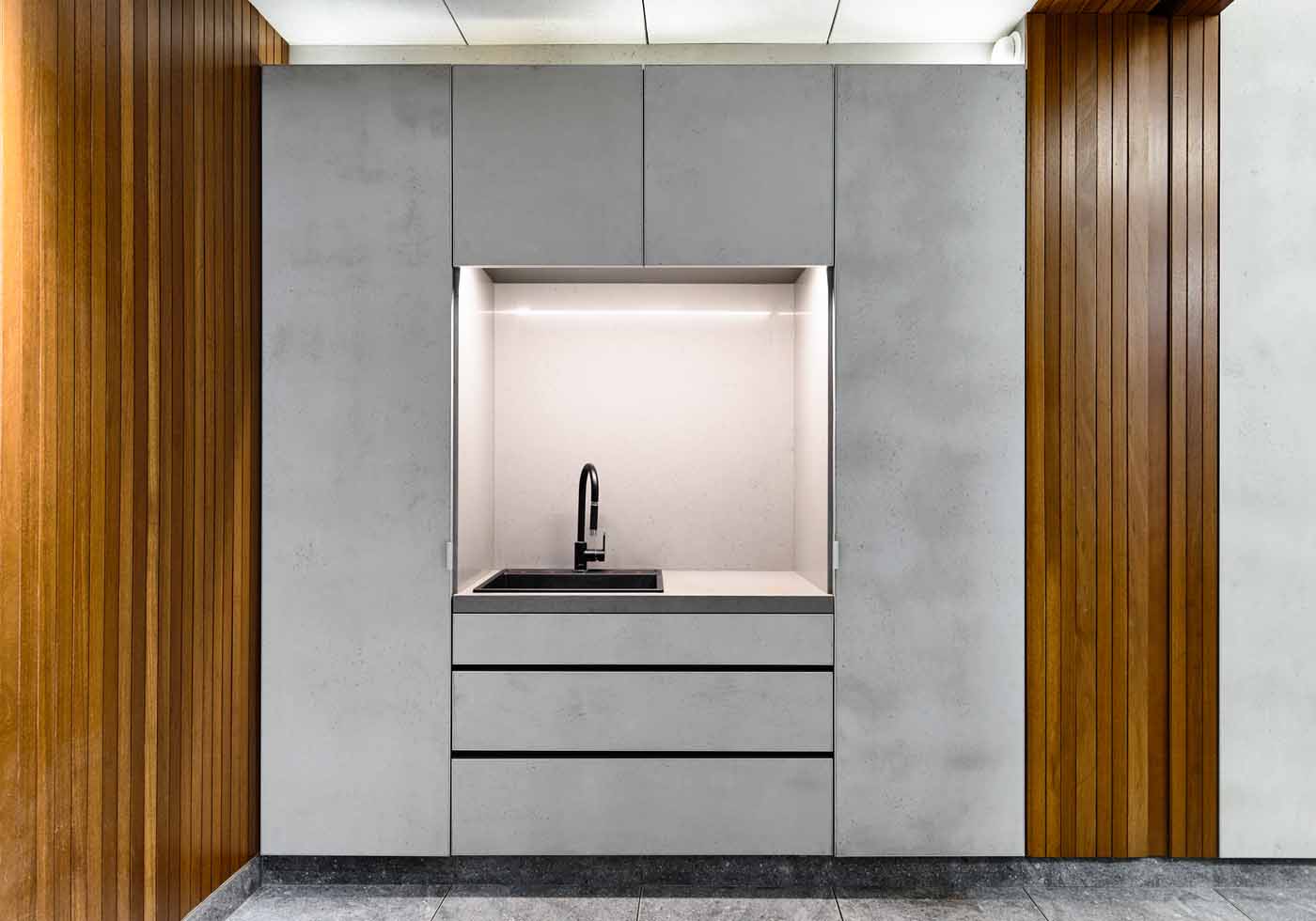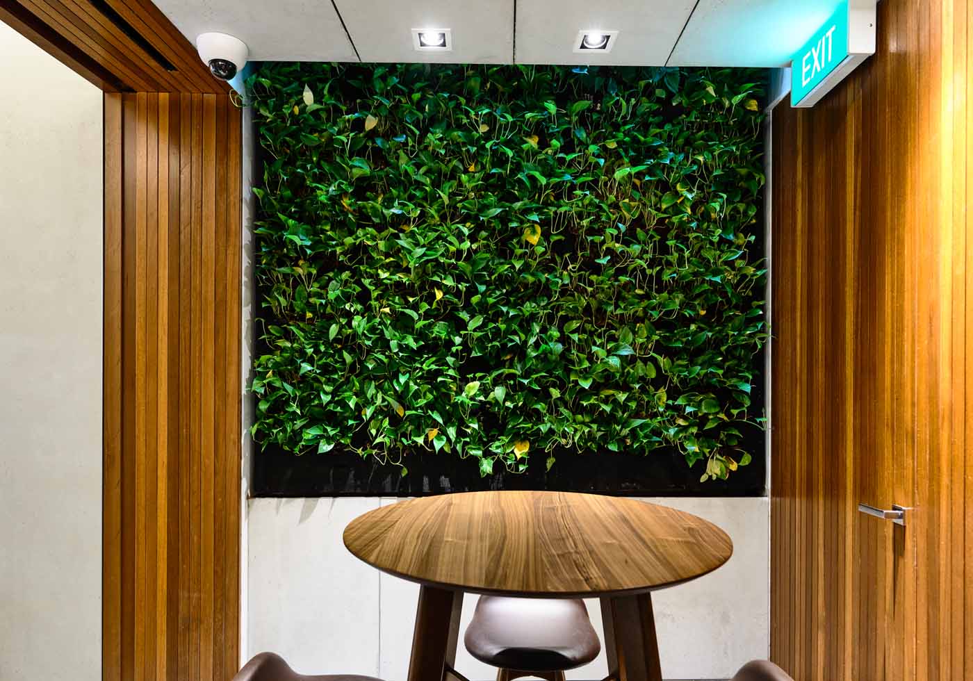 The site is tiny and its width measures just 3.6 metres. The ground floor office is divided into three sections. The first area has a reception and meeting room, the middle is the work area and at the end is a pantry with a green wall.