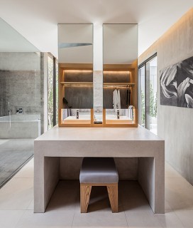 Softening the delineation between inside and out was key to the design concept of each villa, where a tonal color palette of soft greys is warmed by the use of natural wood, while the clean lines of the furnishings complement the patina of the stonework. Inviting living areas open up to the stunning nature outside, and the individual pools are accessed via the stylish bathrooms. Inside, the bathrooms feature oversized tubs, custom bath products, and free-standing wash basins hand-carved by Ang Sila artisans. Spacious walk-in closets and state-of-the-art Marshall Bluetooth home-theater sound systems round off the luxurious amenities.