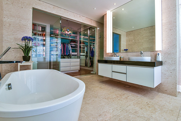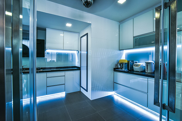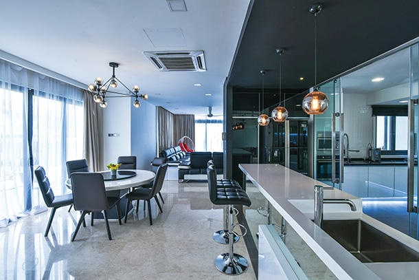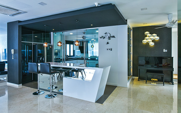 Chic Layers. A combination of reflective and transparent surfaces surrounds the dry kitchen area making this area chic and stylish.