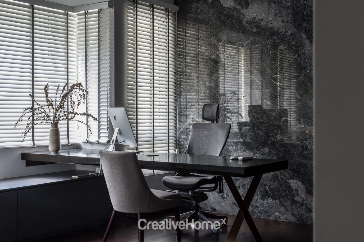 The main home office stands out in an edgy way via a sizeable grey marble feature wall that complements the dark-themed furniture. In the master bedroom, the designers created an ad-hoc workspace via a custom-made shelving system that extends into a console table.