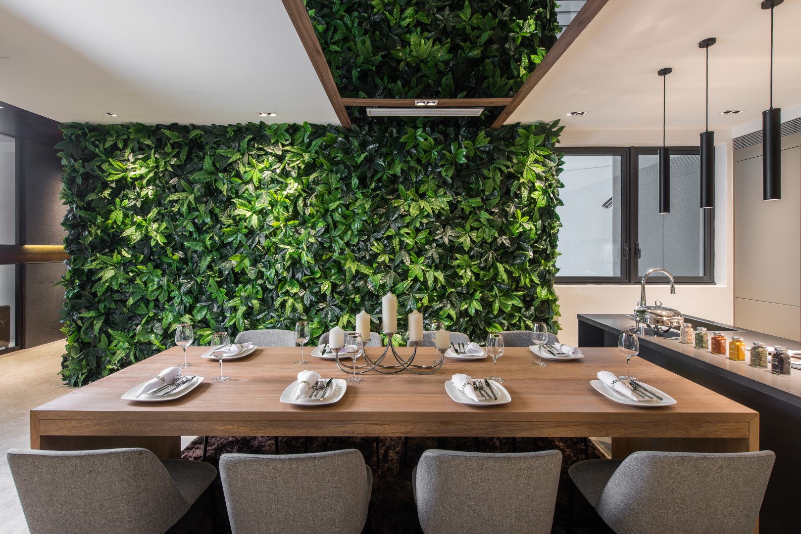 The atmosphere instantly transforms into a bespoke one as you step into the unit; here, the rough stone wall and feature timber ceiling lead you into the home with an indirect division of the living and dining. The dining area is designed with dark mirrors on one side, reflecting the vertical wall of plants on the other side, giving the impression that you are dining in a semi-outdoor space.