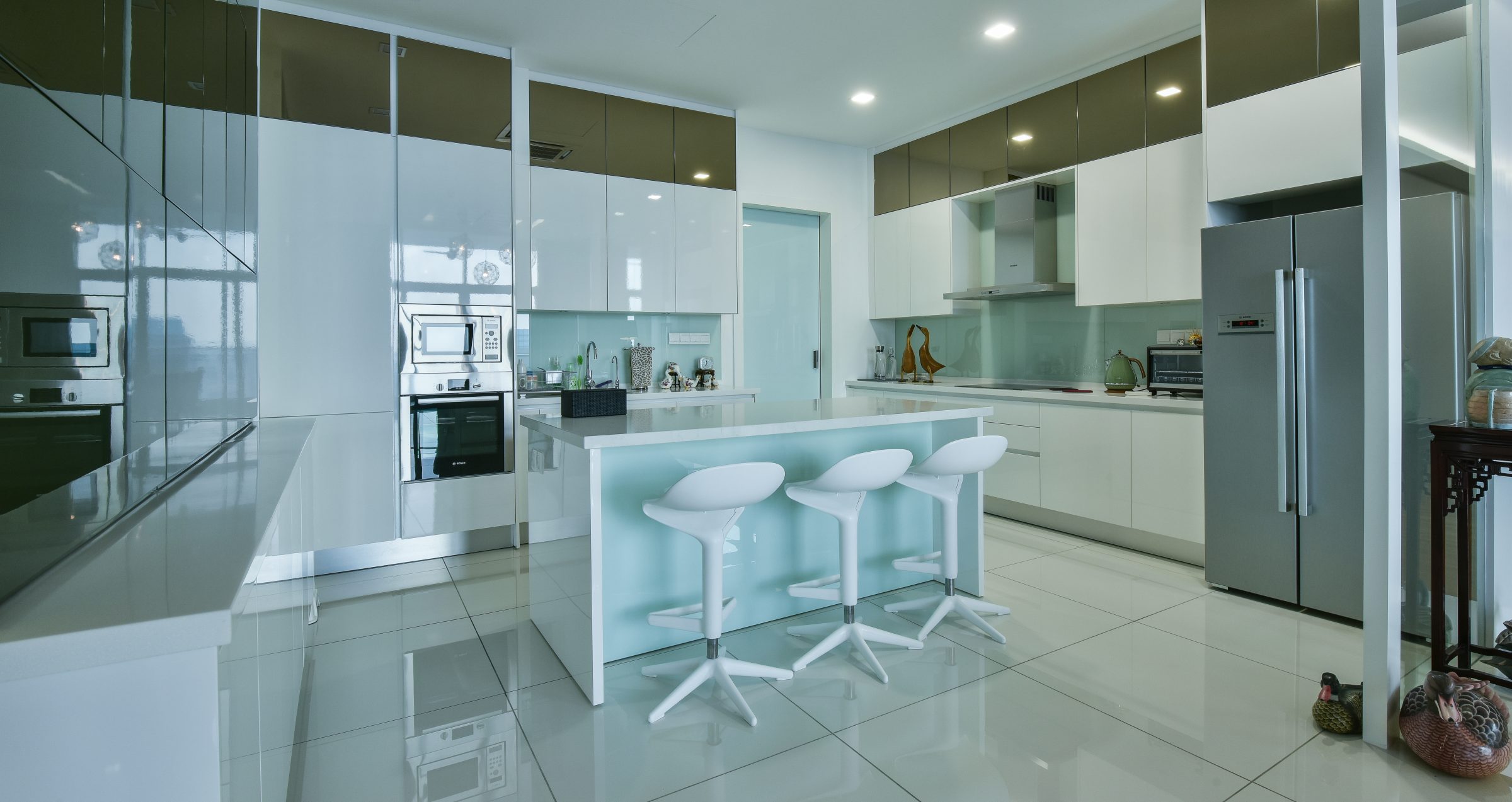 The trio of bar stools extend the reach of the reflective metals occurring at the edges of the space. Interior design by: Q1 Interior Concept