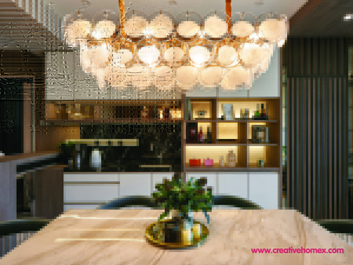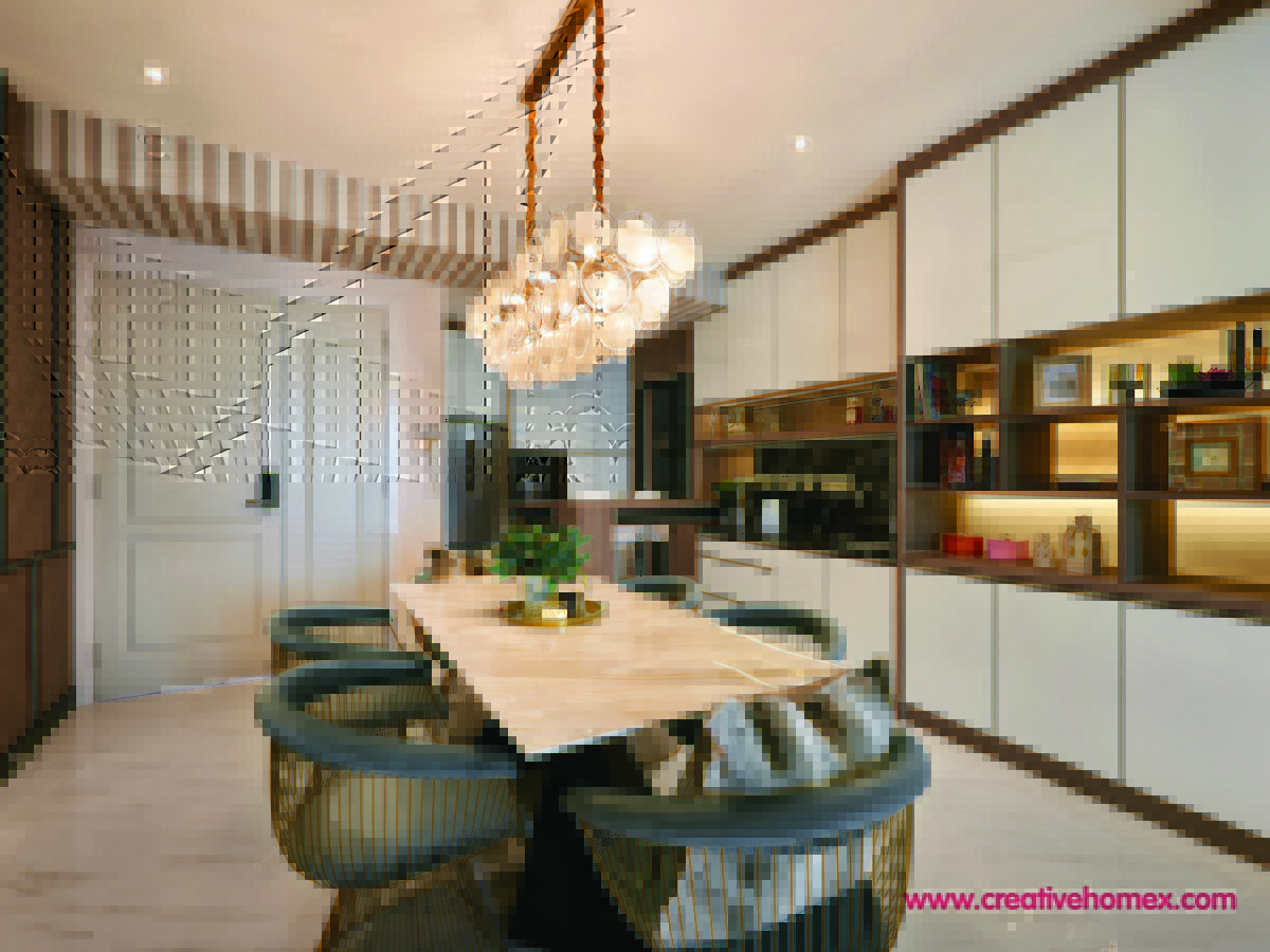 A few steps away, the dining room is a warm and cosy space illuminated by a set of stunning cluster pendant lamps above the marble dining table. Wire-frame chairs infuse a sleek look, bringing the eyes to the opposite feature wall comprising wood panels. On another wall, the entire surface is flushed with built-in cabinets with white finishing and wood frame, leading us visually towards the same approach in the adjacent dry kitchen. The kitchen features white cabinets and a handsome black marble backsplash, which further enhances the contemporary concept. A breakfast counter demarcates the open cookspace, creating depth and a streamlined feel.