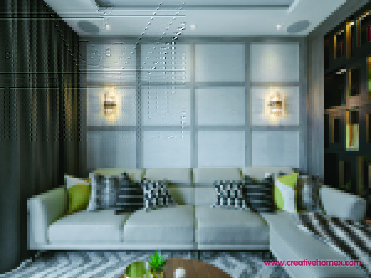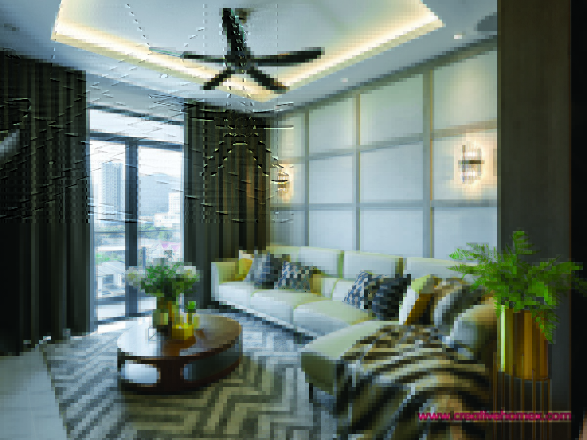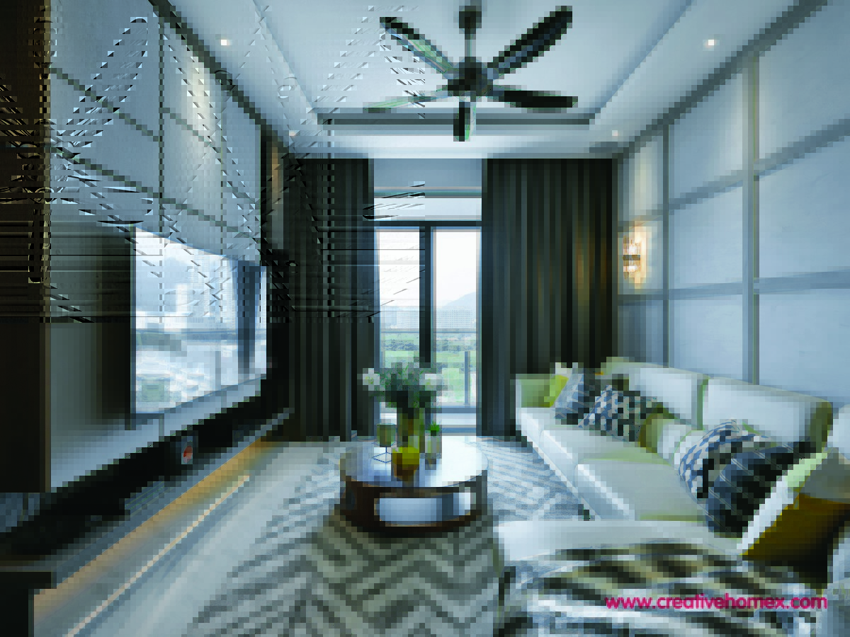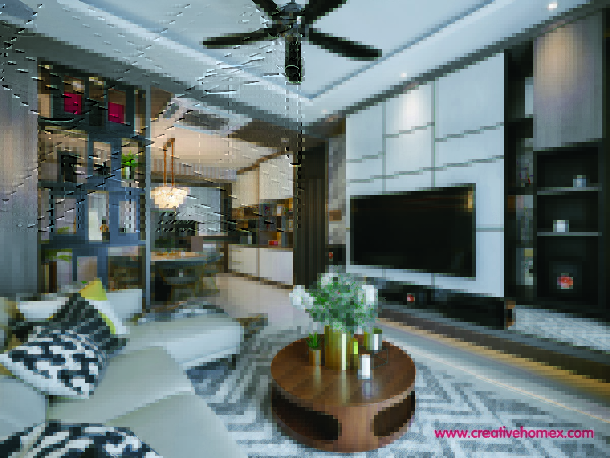 Pure sophistication characterizes this home which has been designed to reflect a modern urban concept. In the living room, grey panelled walls envelope the space in a contemporary way, complemented by the light-toned couch and the round coffee table. Patterns and textures are introduced to balance out the bold neutrals. On the TV wall, panels with black outlines contribute to the overall modern theme while creating a linear appearance to match the partition on the side. Underfoot, an eye-catching rug with zig-zag motifs completes the look.