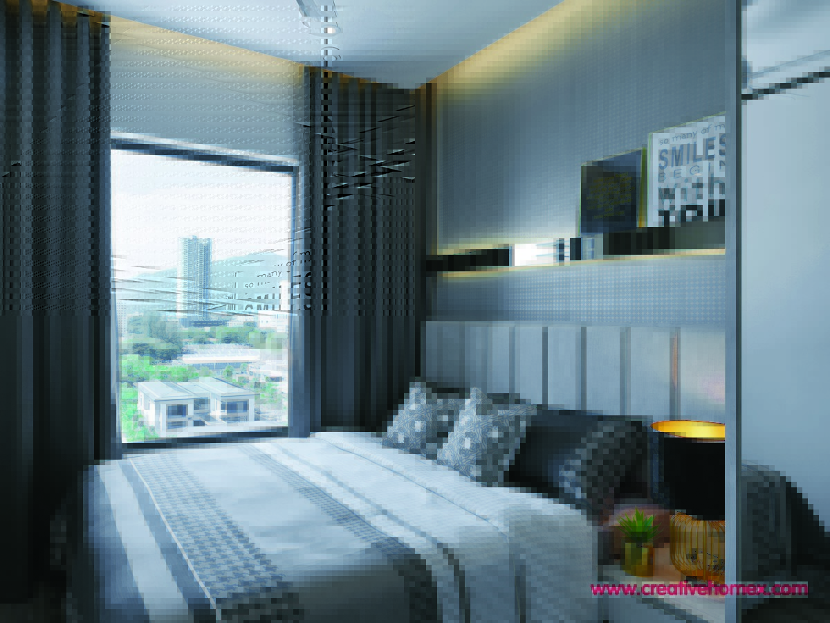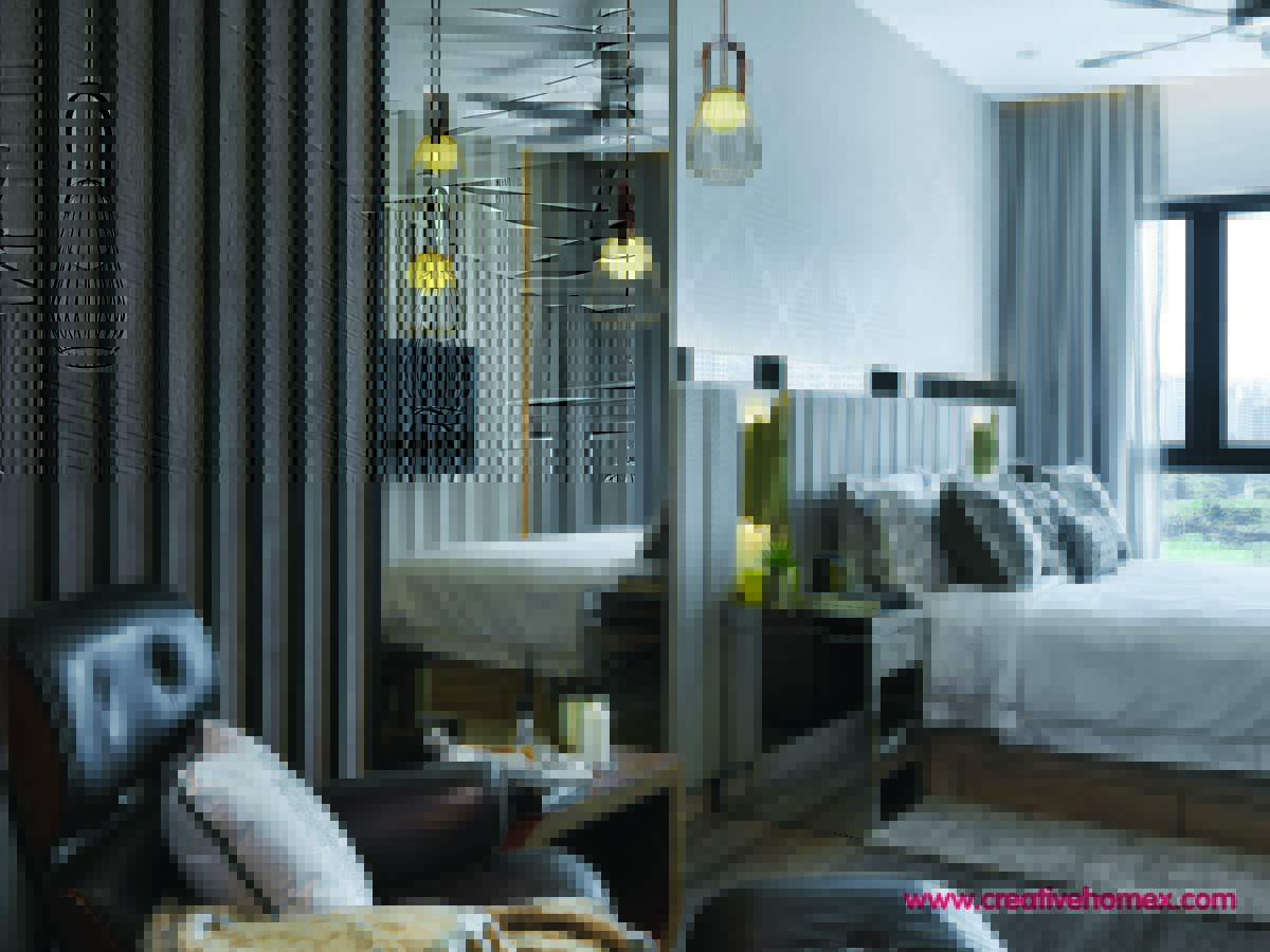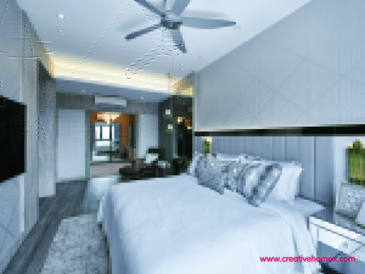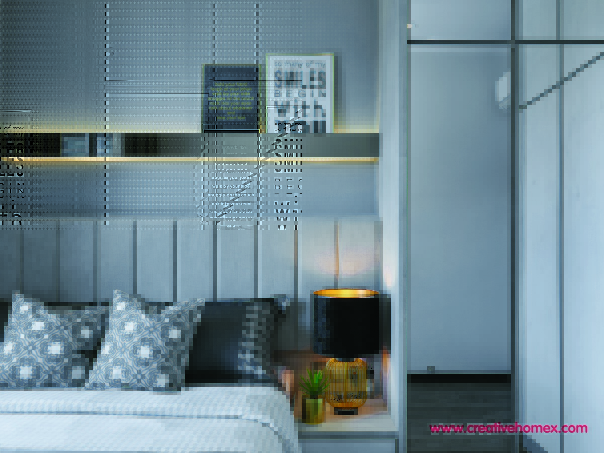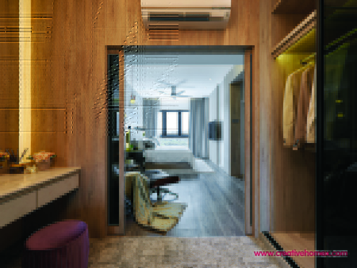 In the master bedroom, a palette of shimmering greys denotes a stylish yet luxuriously romantic setting. The upholstered headboard is set against a backdrop of textured feature wall while shiny bedside tables bring out a glamourous atmosphere. Wall-to-ceiling mirror is also affixed to a section of the wall. However, to tone down the reflective appeal, wood laminate flooring that pairs beautifully with the light-toned wall finishing and the timber detailing on the side wall is used. Here, a black leather armchair with footrest anchors the space with a solid sense of comfort. On the other side of the bedroom, the wall panel slides open into a large walk-in wardrobe. The wardrobes feature mirror surfaces, creating an illusion of an even bigger space. A dazzling modern lamp instils a warm and lush look to the room. Next to it is the master bathroom suite, done up with creamy theme and light wood cabinets.