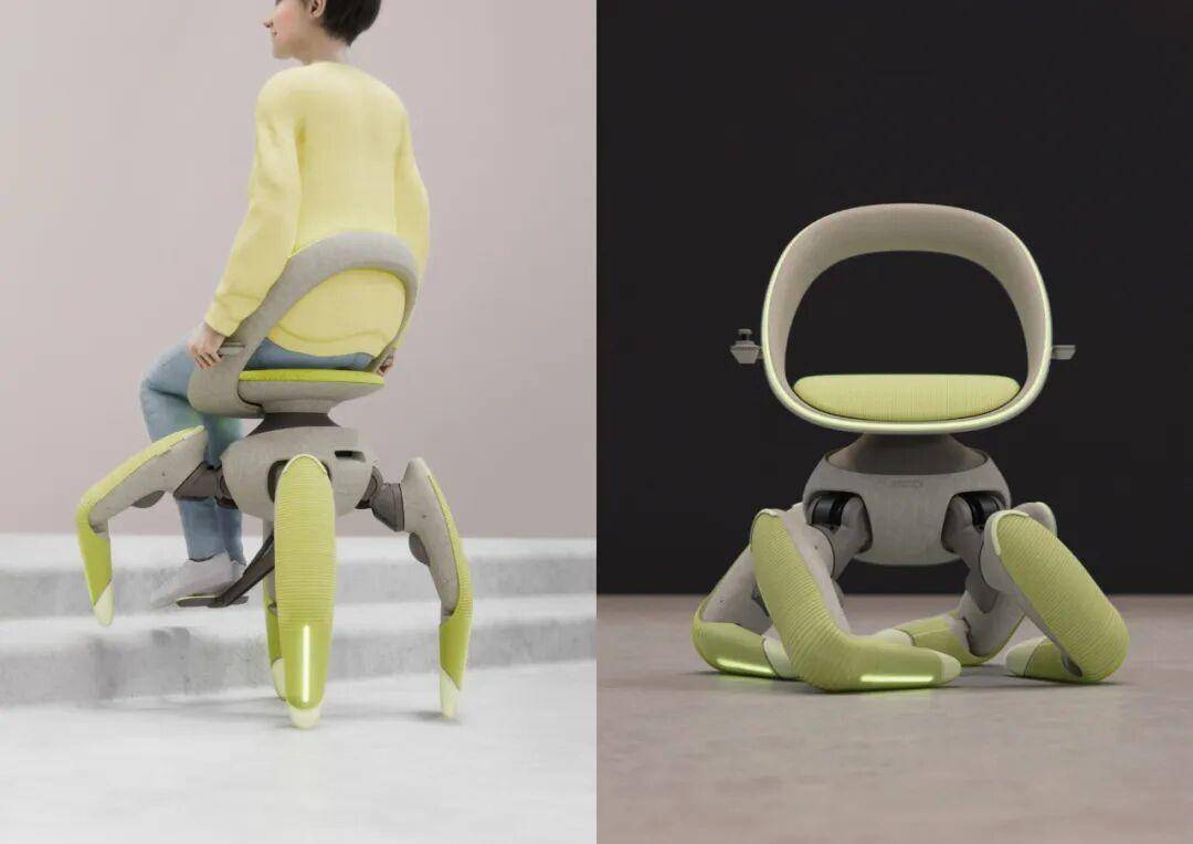 Inspired by biological movement, Walk Me features four articulated robotic legs that mimic the gait of animals such as goats and crabs. Each limb can independently adjust its angle and height, allowing the device to step over obstacles, climb stairs and maintain balance on uneven surfaces. The mechanical structure is carefully concealed beneath soft, rounded surfaces, combining advanced engineering with an approachable, human-centred form.